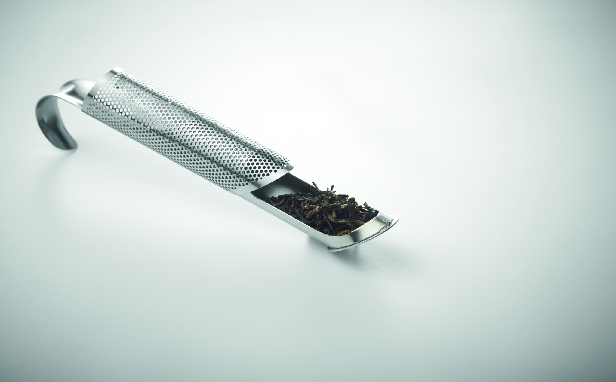 Korduvkasutatav roostevabast terasest torust teetõmmise komplekt puuvillases kotis. Sisaldab kompaktse ja kumera konksuga teefiltrit, mis võimaldab sellel rippuda üle tassi või kruusi serva, ja puhastusharja.