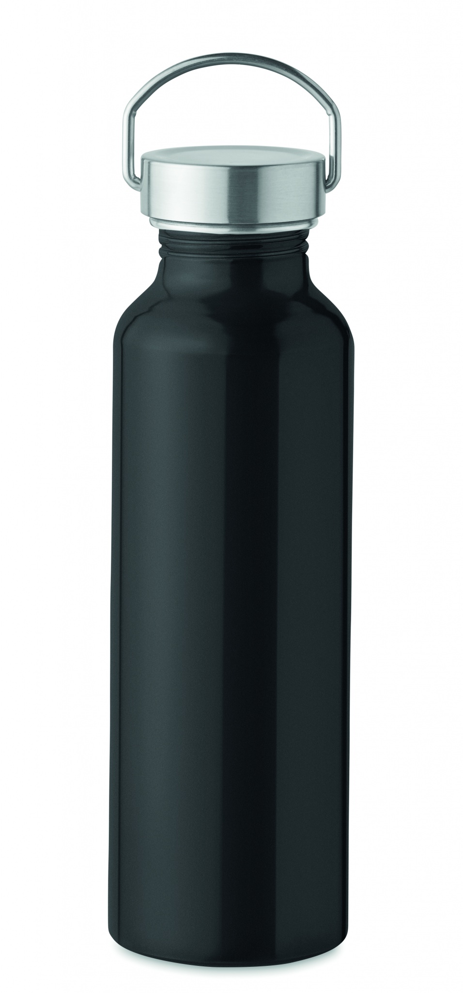 Taaskasutatud alumiiniumist pudel, millel on roostevabast terasest käepidemega kork, Must