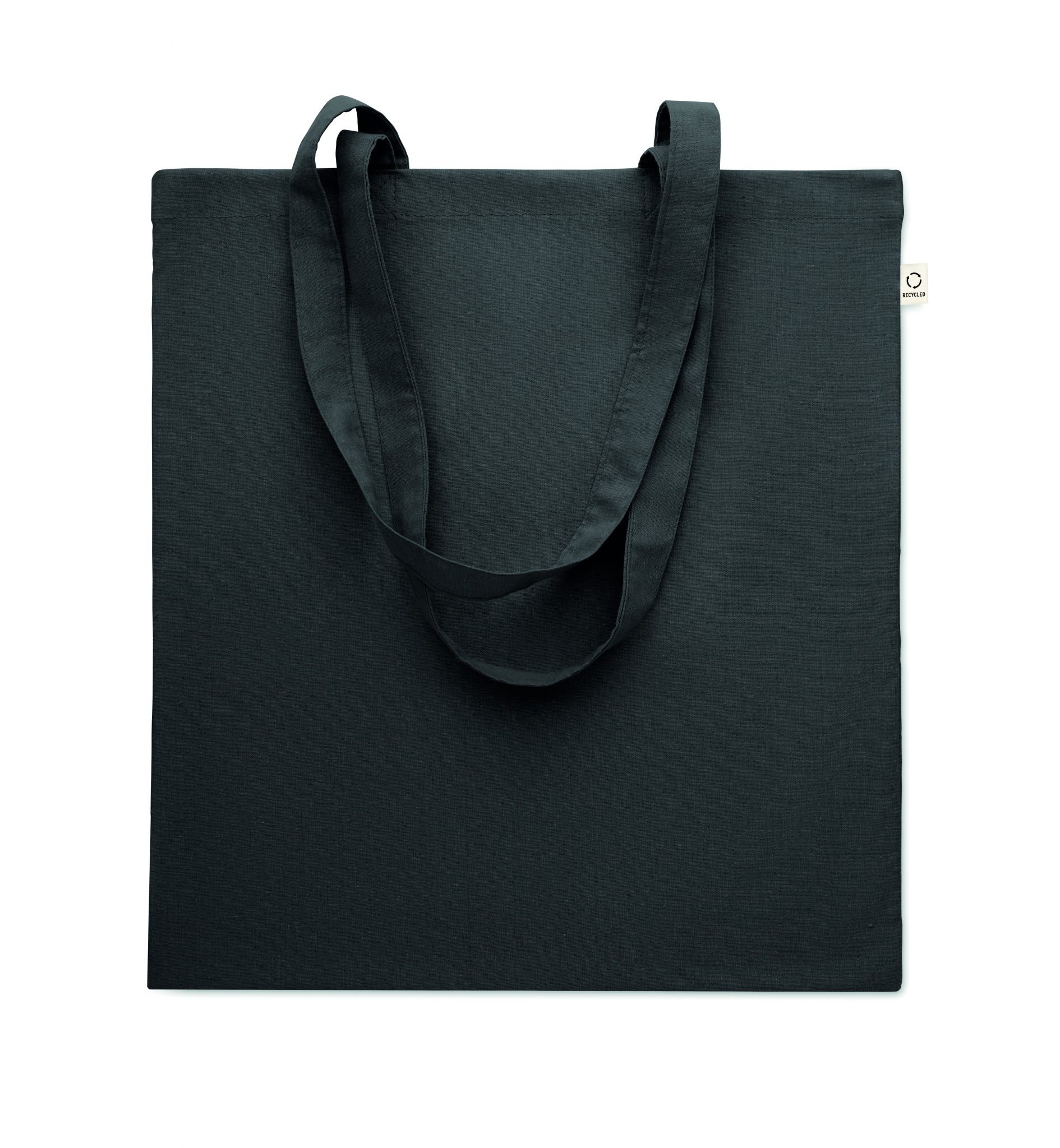 Tarbimiseelsest taaskasutatud puuvillasest ostukott (70% taaskasutatud puuvill ja 30% RPET) pikkade sangadega. 140 gr/m².