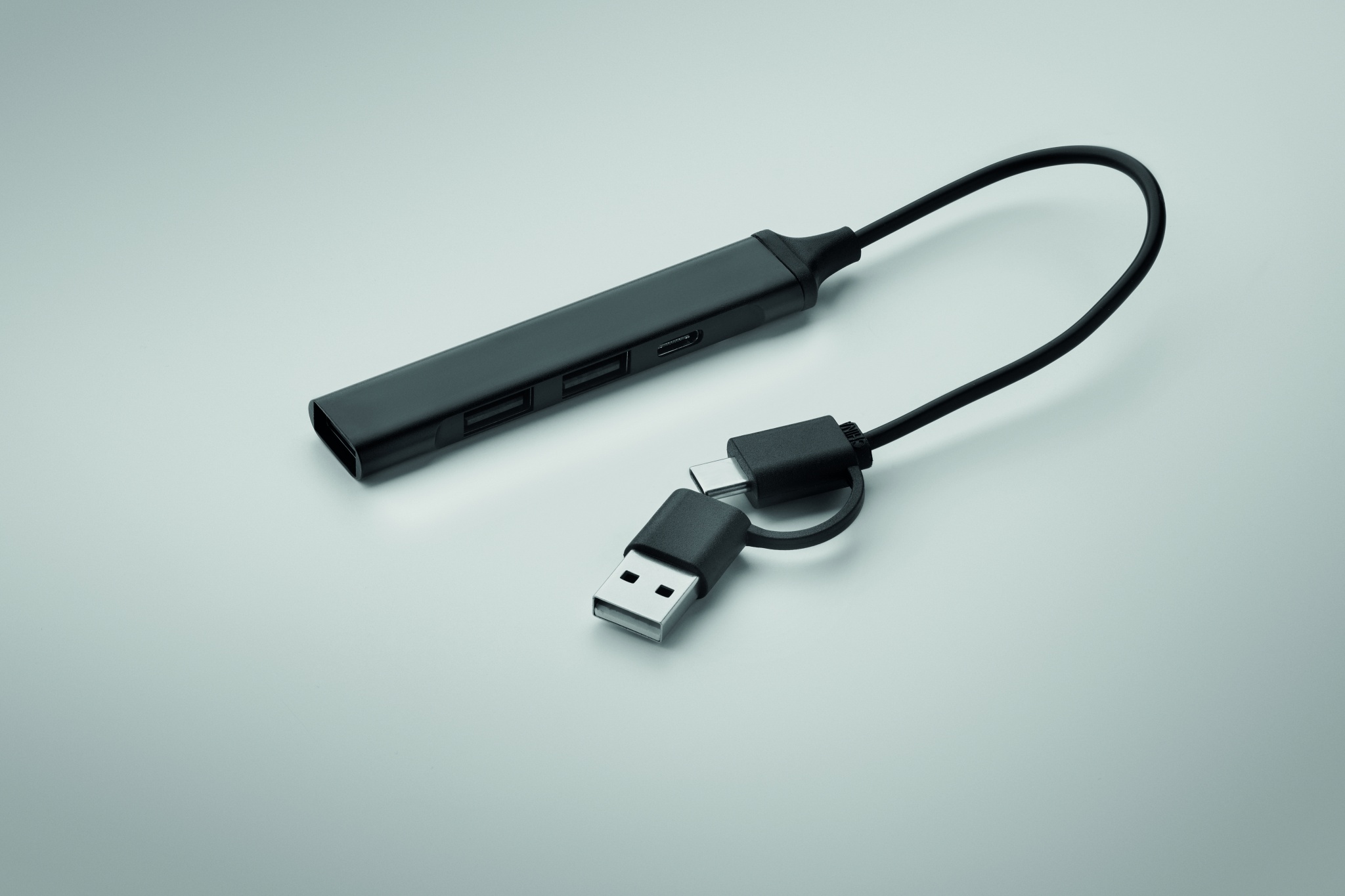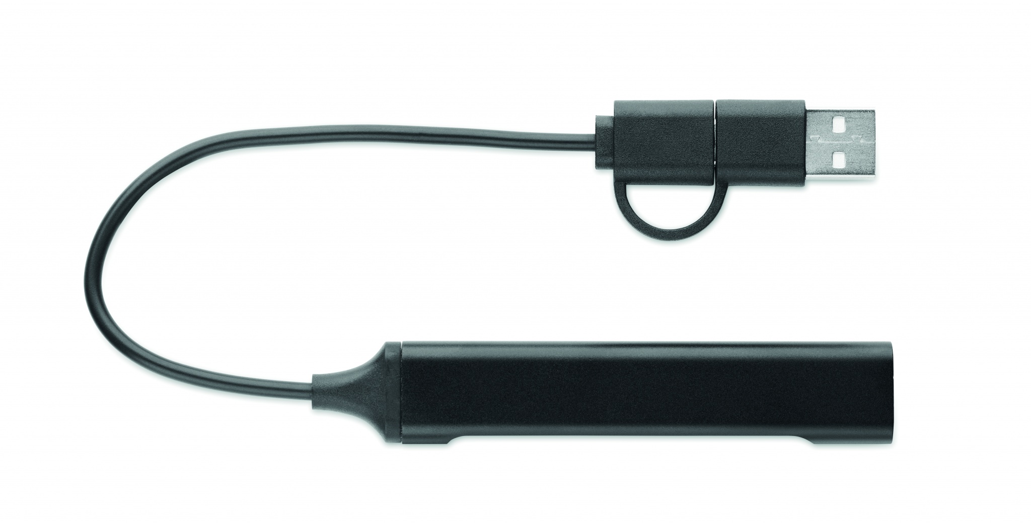 4 pordiga taaskasutatud alumiiniumist USB-jaotur. 3 USB-A + 1 tüüpi C. Sisend: 2-in-1 Type-C & Type-A. Kaabli pikkus: 19 cm.