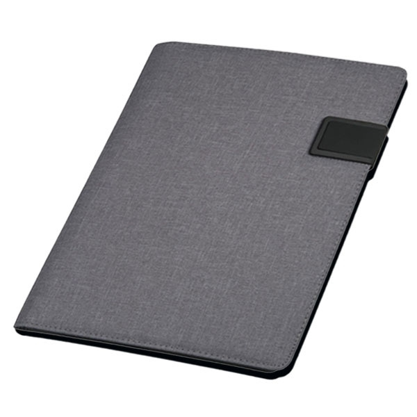 DIN A4 -kansio, jossa on erilaisia lokeroita ja silmukoita, matkapuhelintasku, kirjoitusalusta (20 sivua) ja magneettisuljin. Siirrämme logosi painatuksen etupuolelle.