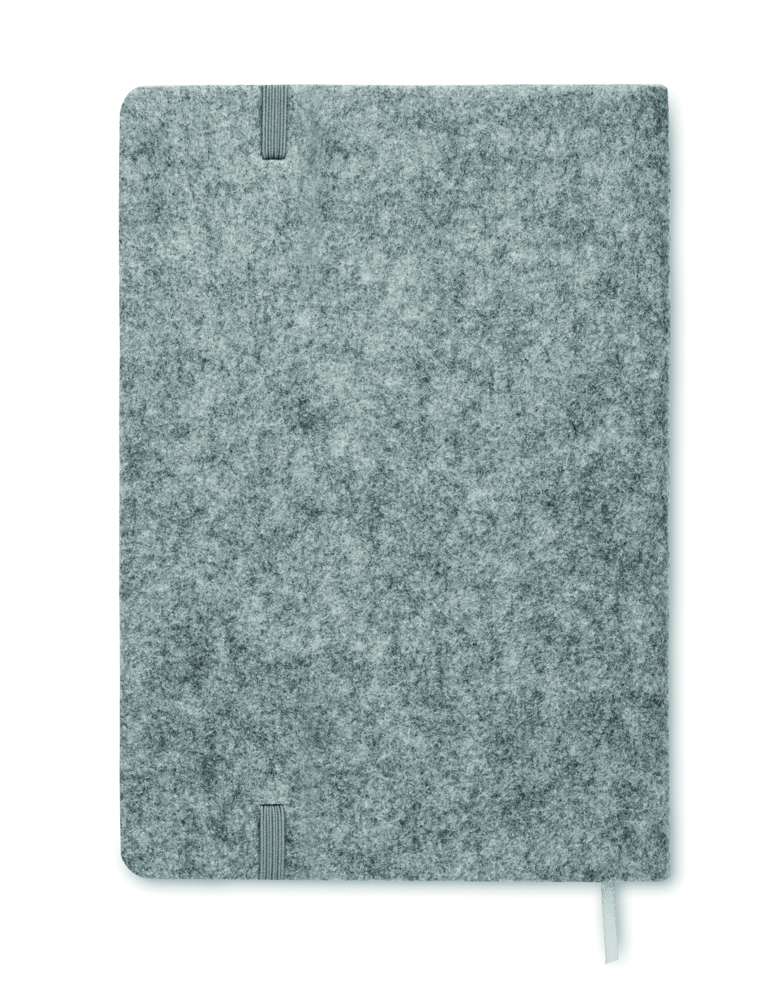 A5-muistivihko RPET-huopakannella ja korkilla. 160 kierrätyspaperilla vuorattua sivua (80 arkkia). Joustava kynälenkki edessä, yhteensopiva joustava suljinnauha ja nauha-sivumerkki.