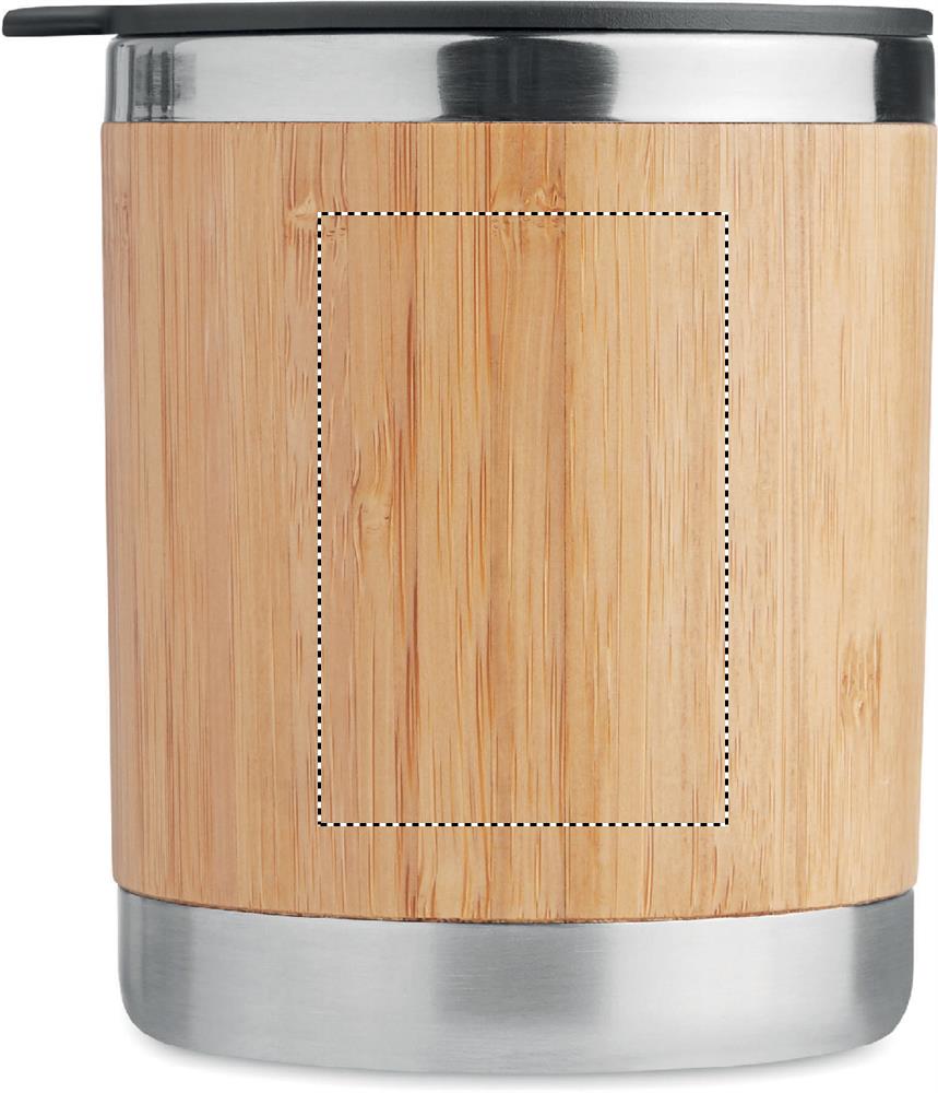 Kaksiseinäinen ruostumattomasta teräksestä valmistettu 250 ml take away muki, bambu kuorella. Luonnollisen materiaalin (bambu) vuoksi, tuotteiden värissä/ koossa saattaa olla erinäisyyksiä ja tämä voi vaikuttaa painatuksen lopputulokseen.
