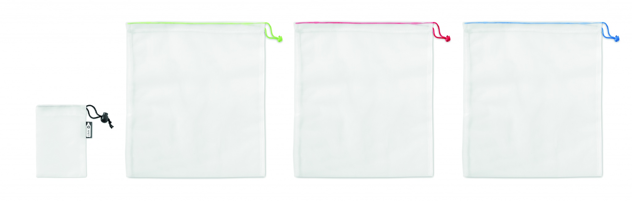 RPET 3 hedelmäpussinsetti, uudelleenkäytettävät hedelmäpussit narukiinnityksellä. Tuote on BPA vapaa ja pesukone ystävällinen.