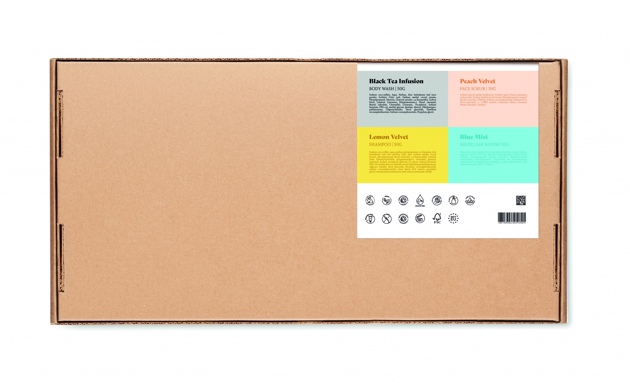 Brandet by earth hoitosetti, sisältää vegaanisen 50gr vartalonpesuaineen, shampoon, kasvojen kuorinnan, kasvoveden ja korkkisen saippuatelineen. Pakattuna pahviseen laatikkoon, valmistusmaa EU.