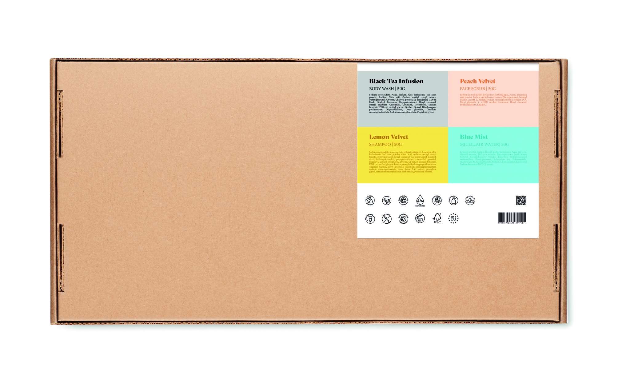 Brandet by earth hoitosetti, sisältää vegaanisen 50gr vartalonpesuaineen, shampoon, kasvojen kuorinnan, kasvoveden ja orgaanisen puuvilla matkapussin. Pakattuna pahviseen laatikkoon, valmistusmaa EU.