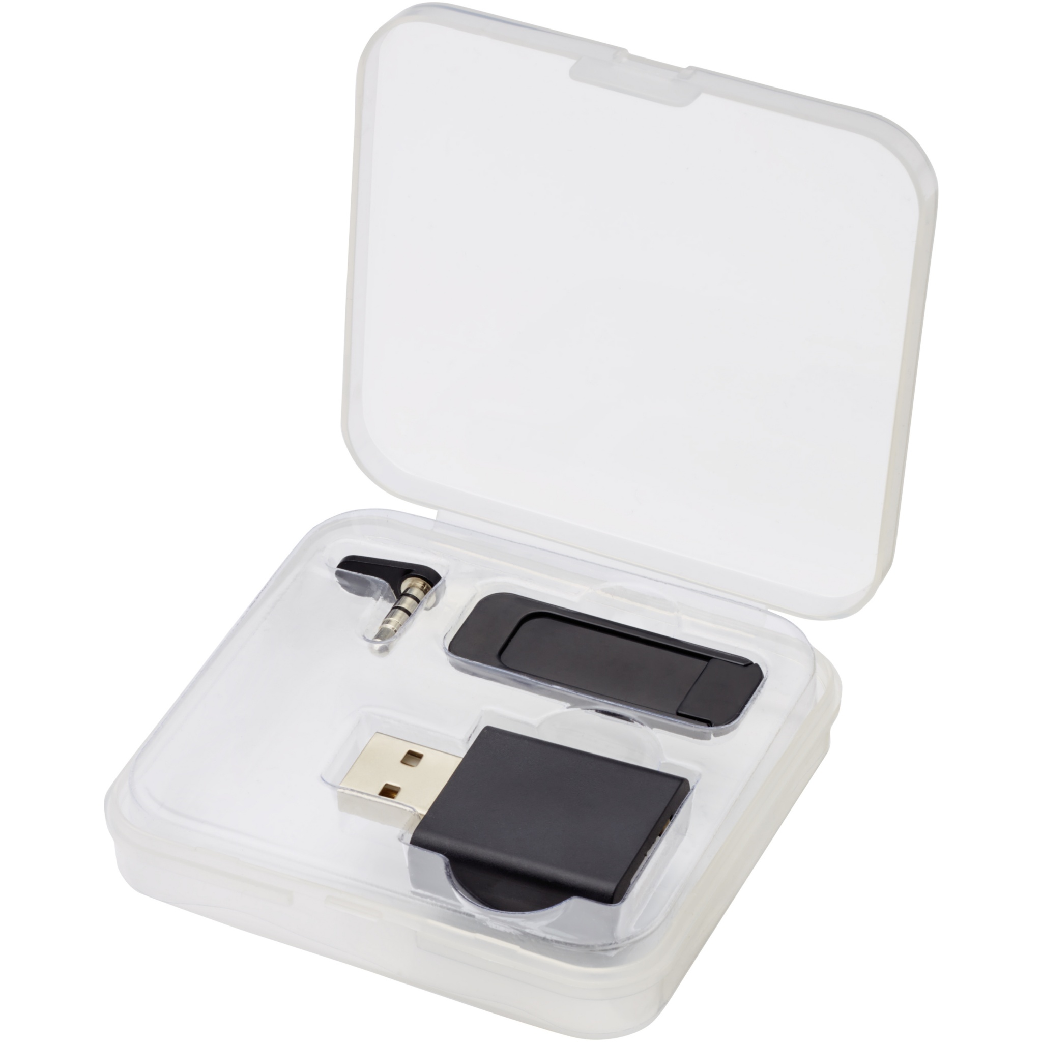 Digitaalinen tietosuojapaketti, joka sisältää USB-tietosuojan, verkkokameran linssisuojan ja ääniliittimen suojan. USB-tietosuoja estää tahattoman tiedonvaihdon, kun mobiililaite kytketään tietokoneeseen tai julkiseen latausasemaan. Väline tukkii tiedonsiirron laitteen lataamisen aikana, mikä estää tietojen varastamisen ja haittaohjelmien asentamisen. Web-kameran linssisuoja voidaan kiinnittää kannettavan tietokoneen web-kameran eteen estämään kaikki ei-toivottu pääsy web-kameraan. Ääniliittimen suoja voidaan sijoittaa laitteen AUX-porttiin, jotta kolmannet osapuolet eivät voi kuunnella keskusteluja. Toimitetaan suojakotelossa.