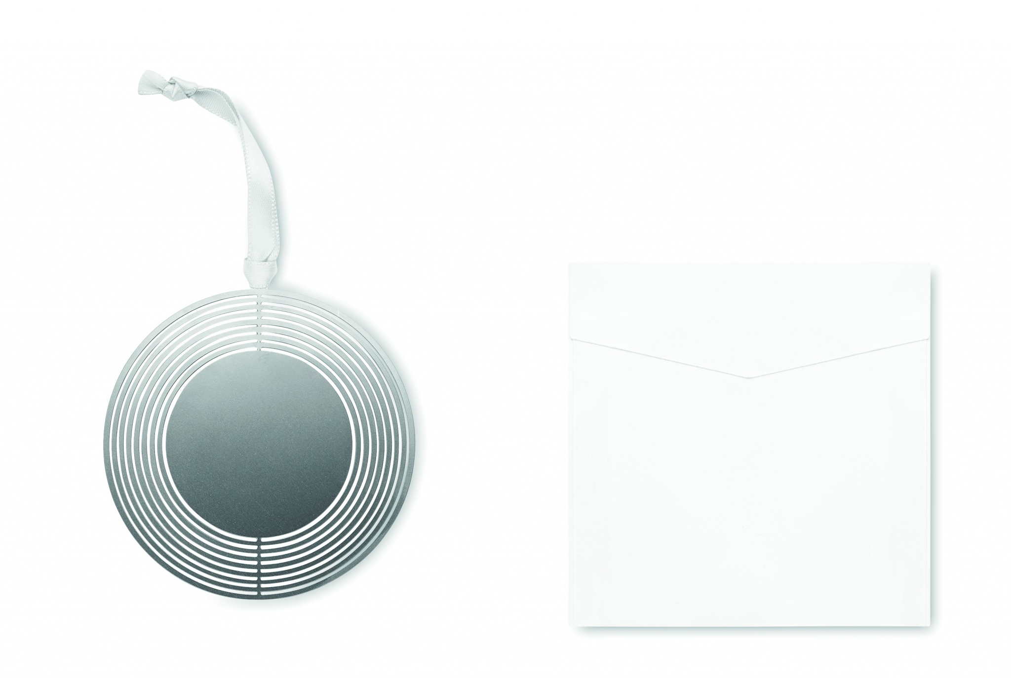 Ruostumattomasta teräksestä valmistettu ympyrän muotoinen koriste, nauhalla. Pakattuna lahjakuoreen, helppo lähettää postissa litteän muodon vuoksi.