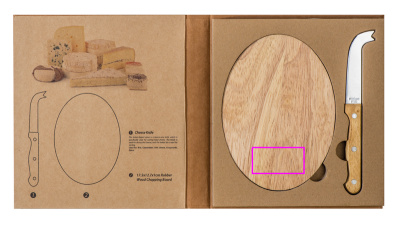 Juustosetti sisältää pyöreän puulevyn ja ruostumattomasta teräksestä valmistetun juustoveitsen, jota voidaan käyttää myös tarjoiluun. Logosi kaiverretaan taululle.