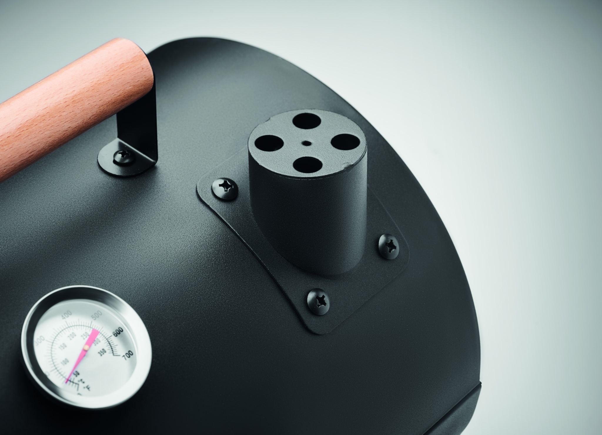 Kannettava grilli, rautaa, savupiippu ja lämpötilamittari. Mustaksi pulverimaalattu tulipesä. Lukitussalpa ja puinen kantokahva.