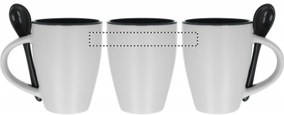 Kaksivärinen keraaminen kahvimuki 250 ml, sisältää lusikan. Tampopainatus kestää vain käsinpesun, keraaminen painatus on konepesun kestävä. Mikroaaltouunin kestävä, yksittäispakattuna 11,5x10,5x9,3cm laatikkoon.