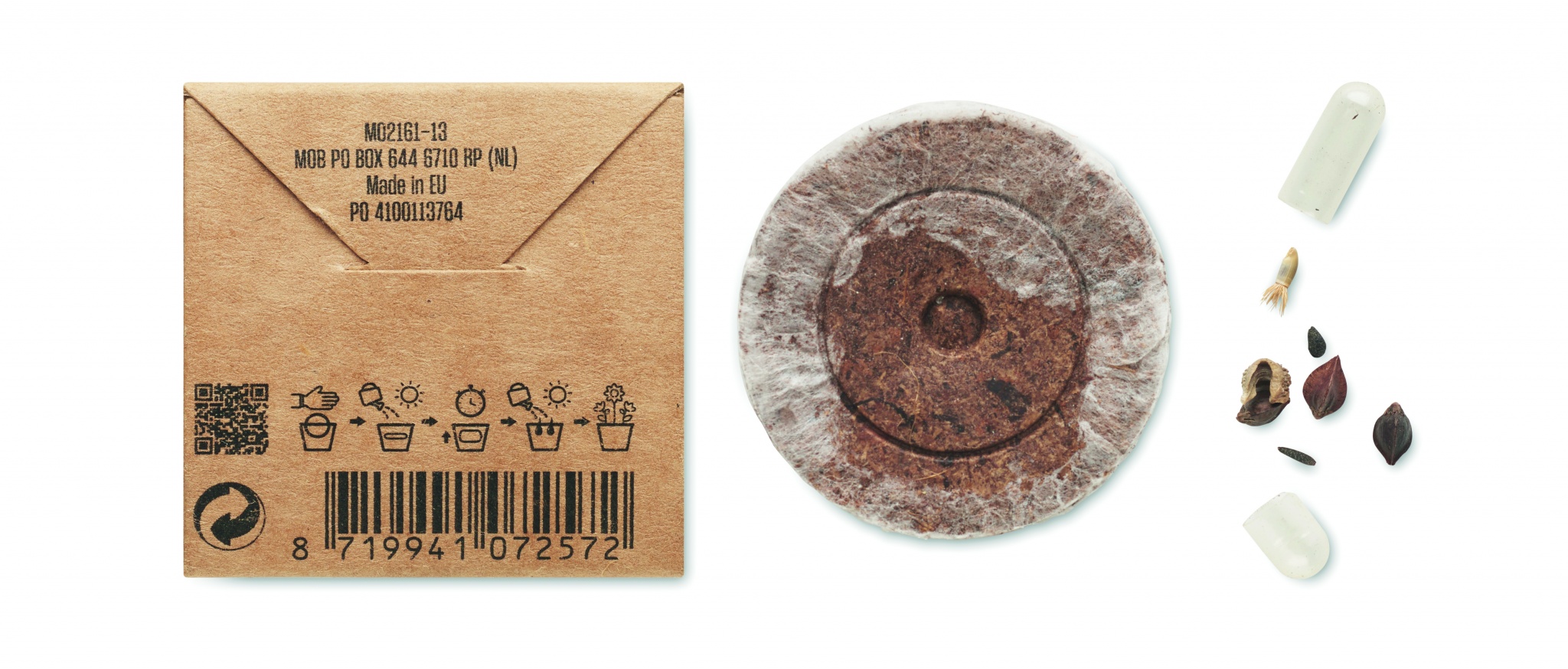 Puristettu turvekiekko kesäkukkien siemenseoksella, pahvilaatikossa. Valmistettu EU:ssa.