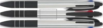 Kuulakärkikynä kosketusnäyttöpäällä ja 3 musteen väriä punainen, sininen ja musta.
