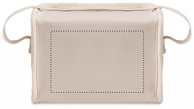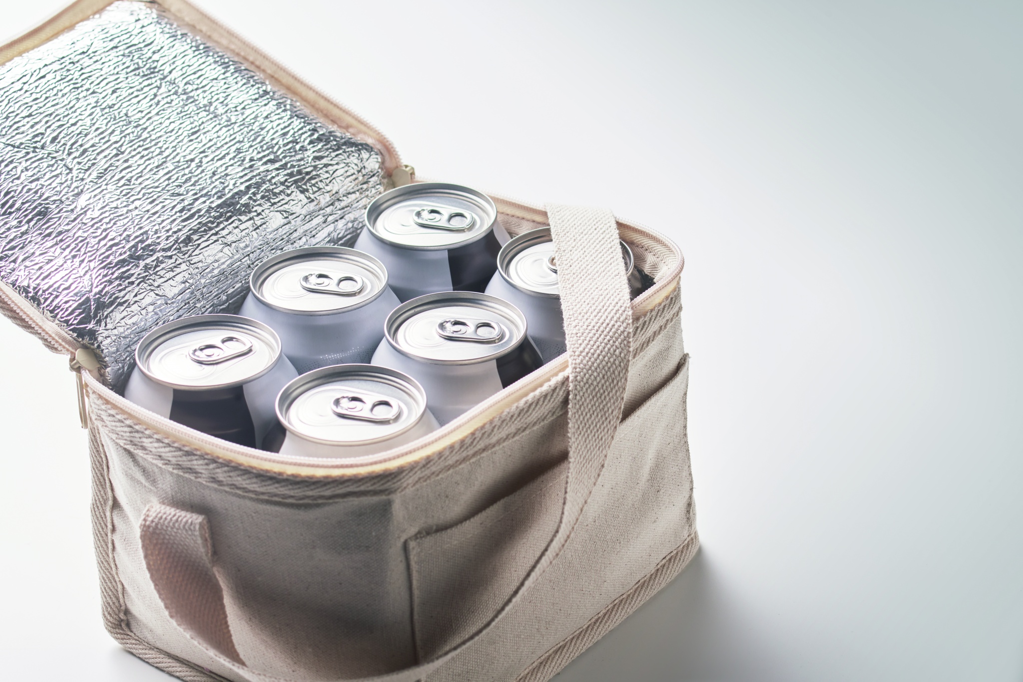 Puuvillainen 280 gr/m² kylmälaukku, jossa on etutasku. 3 mm eristävä alumiinilaminoitu folio. Tilavuus 3 L.