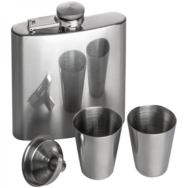 Kaunis setti, joka koostuu lantiopullosta (tilavuus 170 ml), kahdesta ammuskupista ja suppilosta, ruostumatonta terästä. Logosi laseroidaan lantiopulloon.