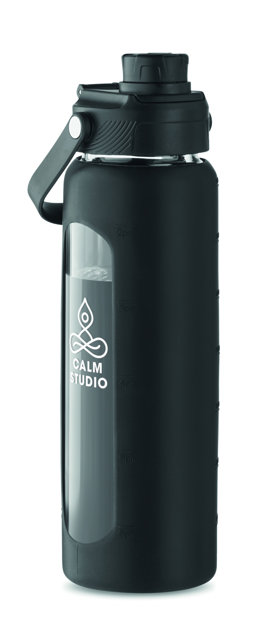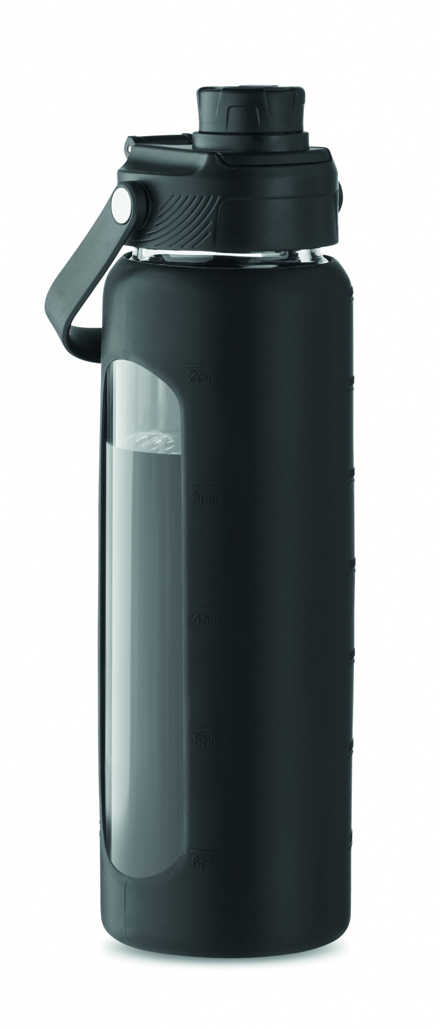 Korkea borosilikaattilasipullo, jossa on silikoninen läpinäkyvä hylsy ja PP-kansi kantokahvalla. Vuotamaton. Tilavuus: 750 ml.