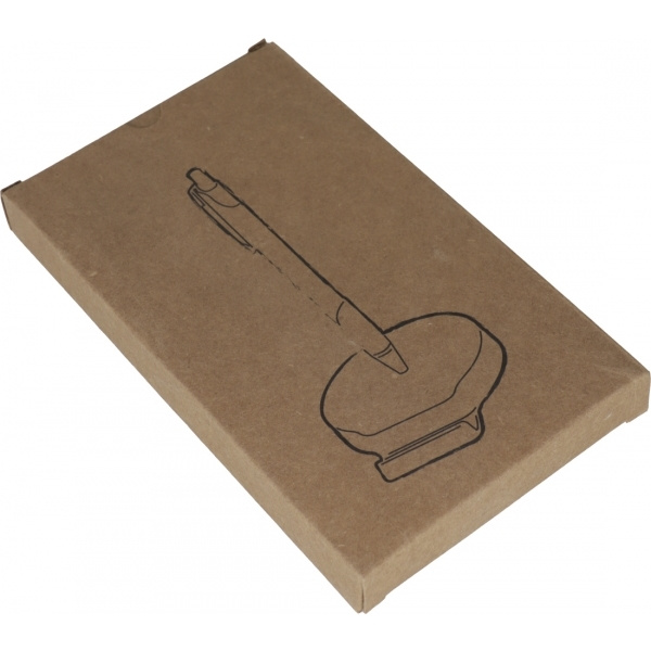 Matkapuhelinteline liukuestetyllä pohjalla, magneettitoiminnolla ja sinikirjoituksella metallikuulakynällä. Logosi painetaan etupuolelle.