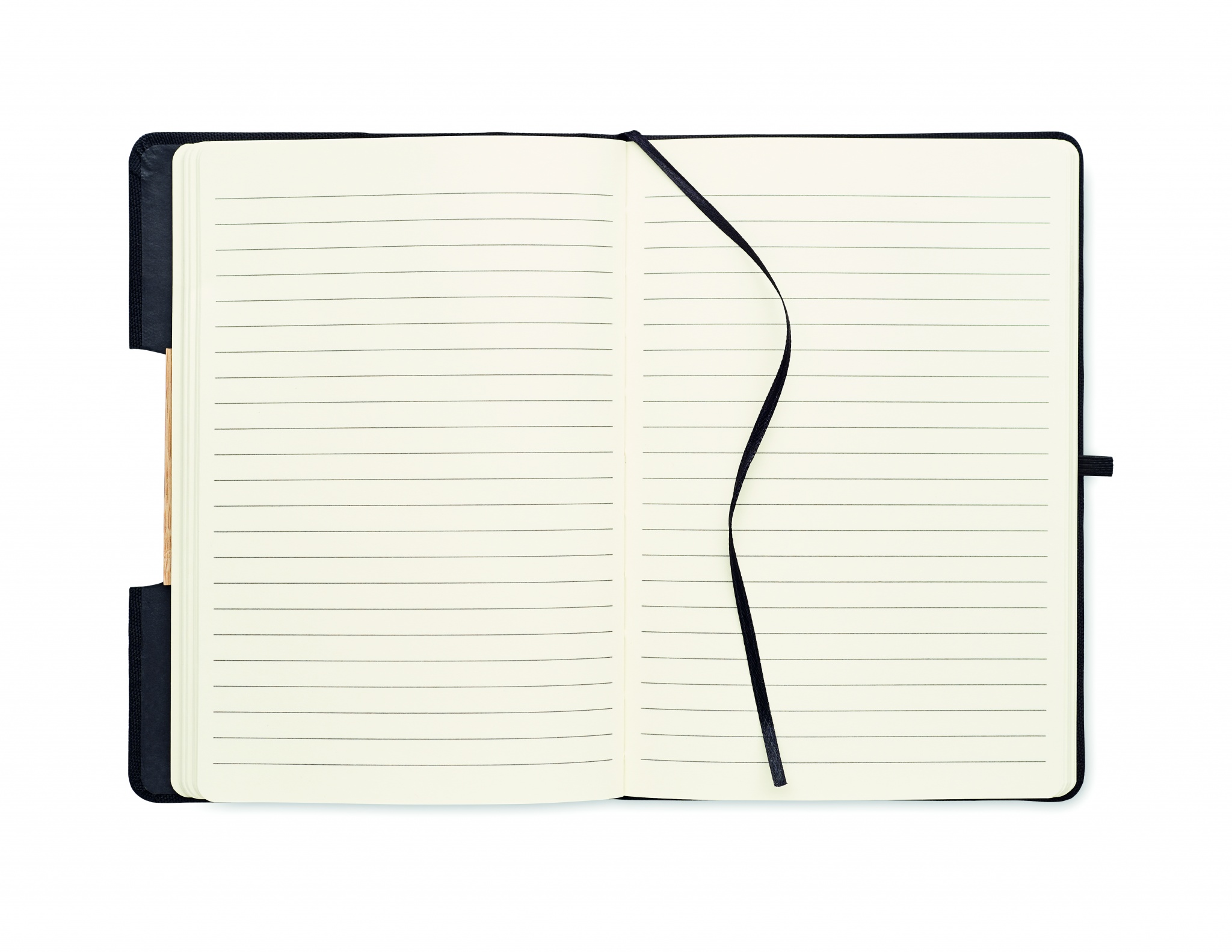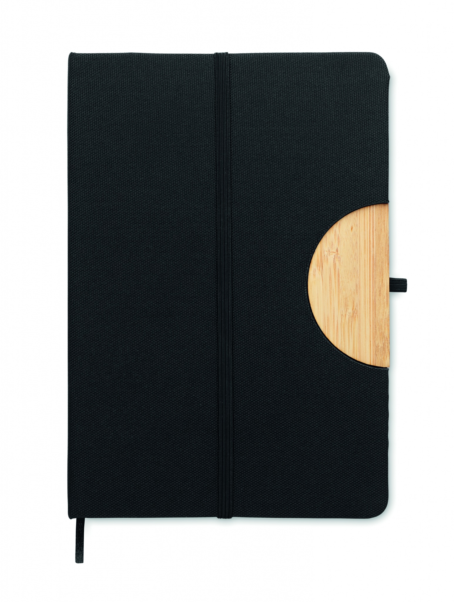 A5 muistikirja kovalla RPET kannella, bambu yksityiskohta toimii puhelintelineenä. 160 viivoitettua kierrätettyä sivua (80 arkkia) ja väriltään yhteensopiva elastinen suljin.