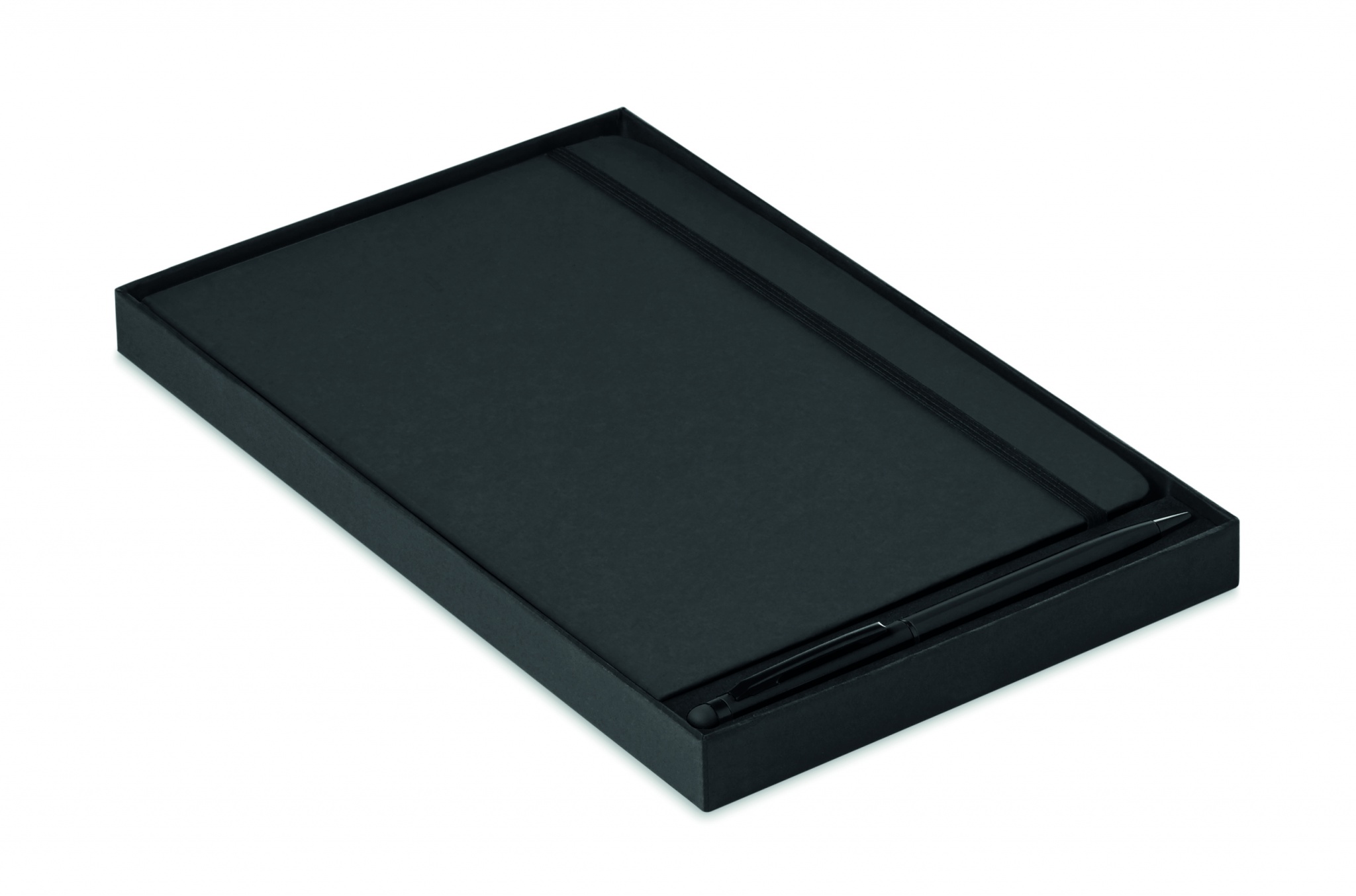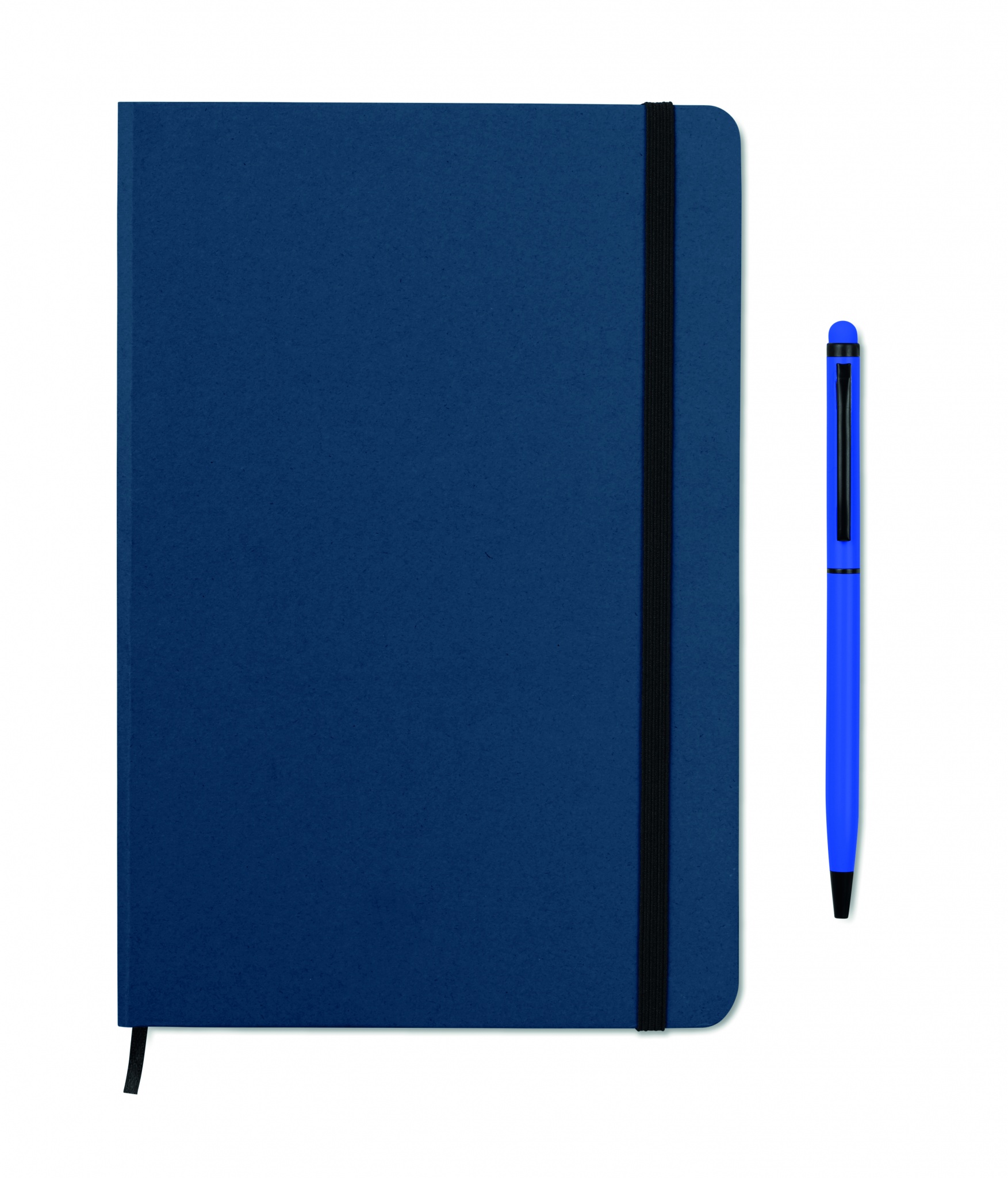 A5 muistikirja kovalla PU kannella, väriin yhteensopivalla 2-1 stylus kuulakärkikynä sinisellä musteella ja kosketusnäyttöpäällä. Muistikirjassa 144 viivoitettua sivua (72 arkkia) sisältää kumilenkin ja kirjanmerkki.