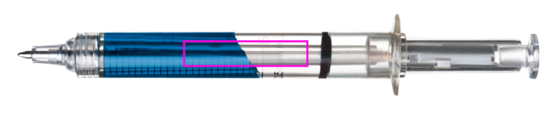Ruiskun muotoinen kynä, jossa sininen tai punainen muovinen kirjoitustäyttö. Painamme logosi mustalla, vastapäätä mittakaavaa.