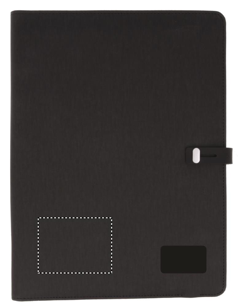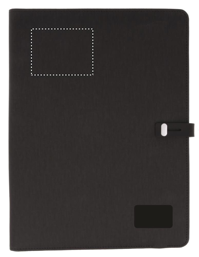 A4 PU- portfolio langattomalla latausjärjestelmällä, lähtövirta DC5V/1A. Sisältää 4000 mAh vara-akun mikro USB C portin liittimellä, 20 sivuisen muistikirjan, korttikotelon ja kynänsilmukan.
