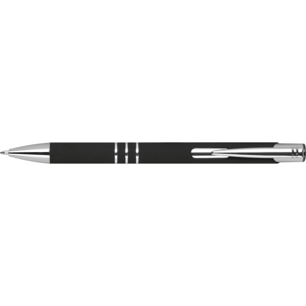 Kierrätetystä alumiinista valmistettu puoligeelikynä, jossa on kumitettu pinta ja sinikirjoitus suurikapasiteettinen täyttö (puoligeelikärki 0,7mm).