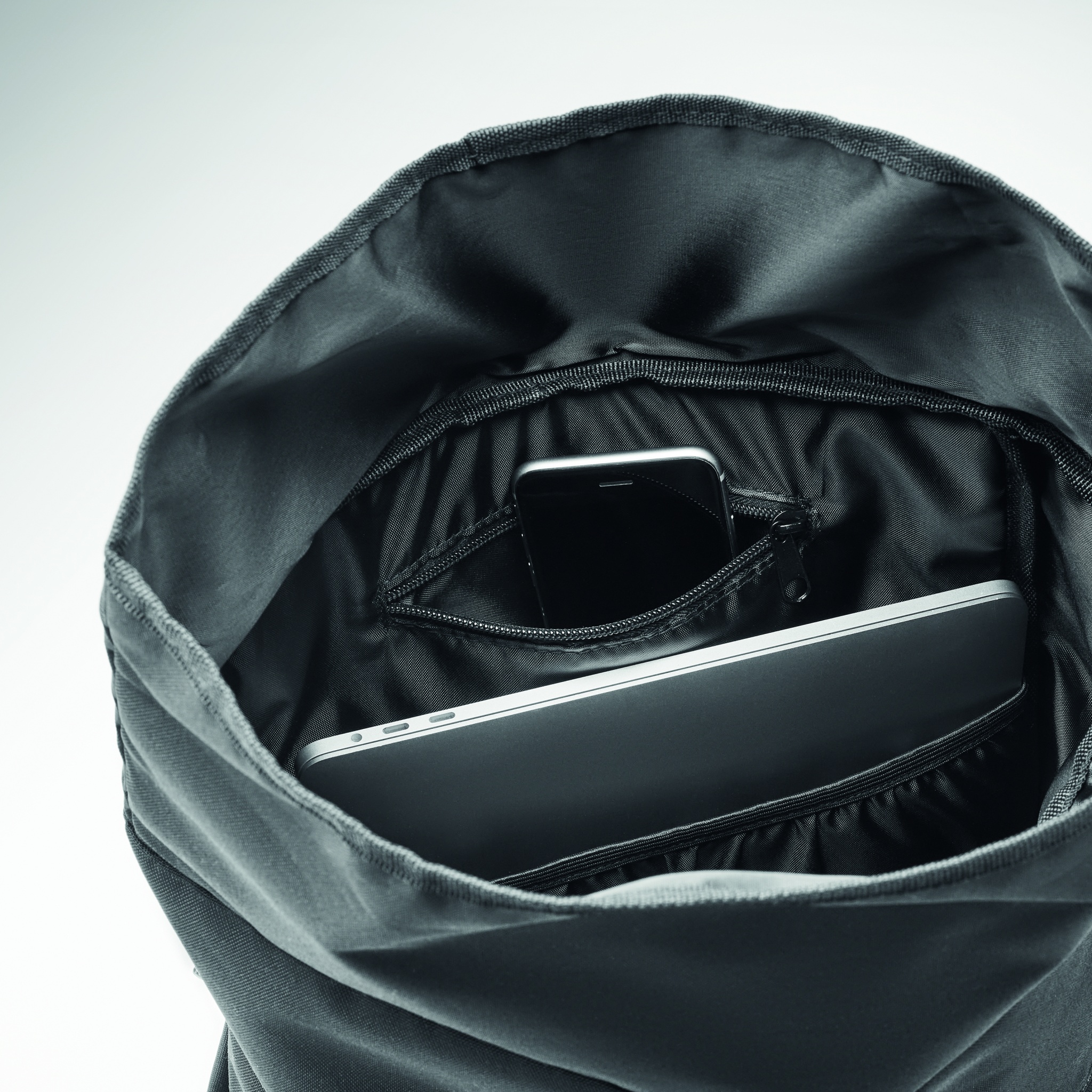 Reppu 600D RPET-polyesteriä, jossa on pehmustettu selkä ja pohjavahvistus. Vetoketjullinen etutasku. Vuori on RPET 210D RPET:tä. Reppu suljetaan yläreunasta rullaamalla.