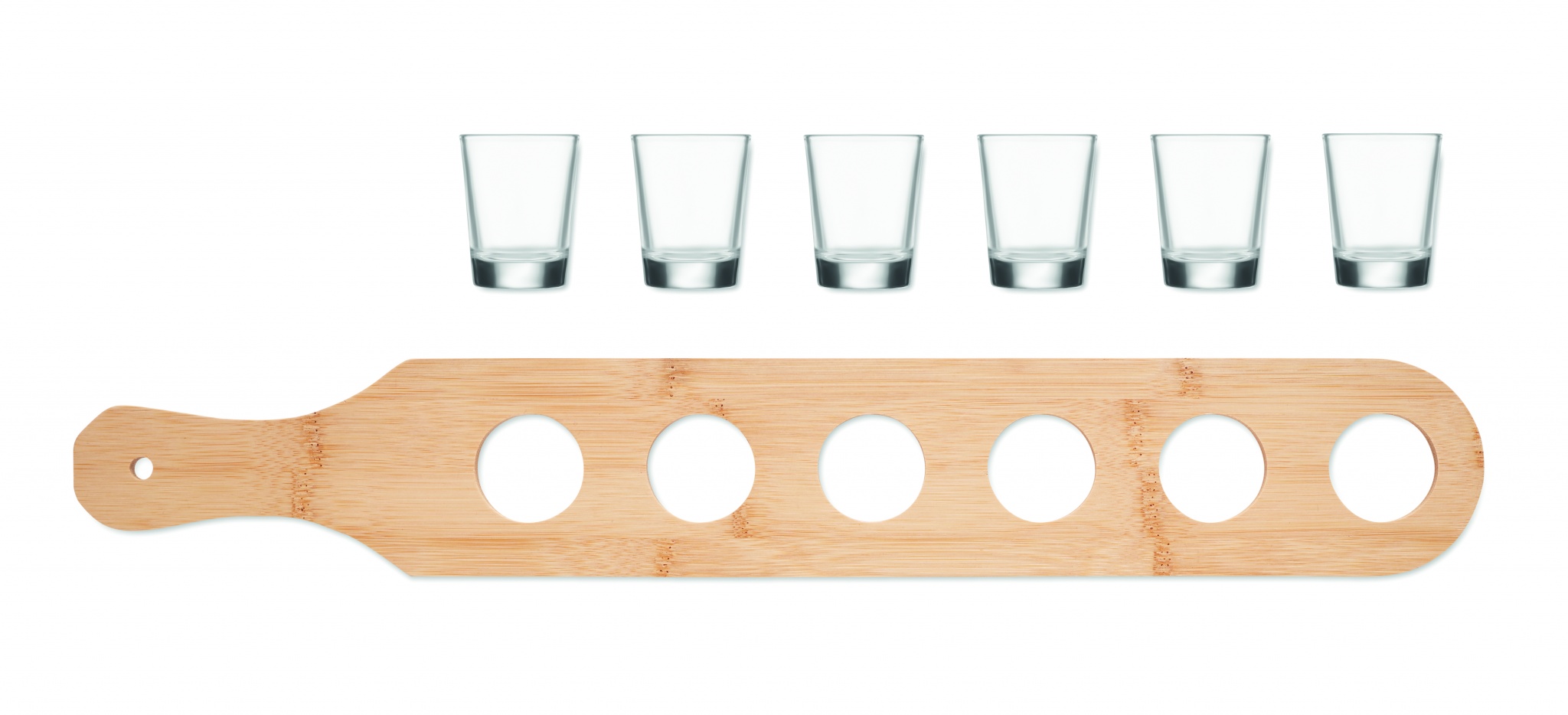 6x 20 ml shottilasinsetti bambuisella tarjottimella.