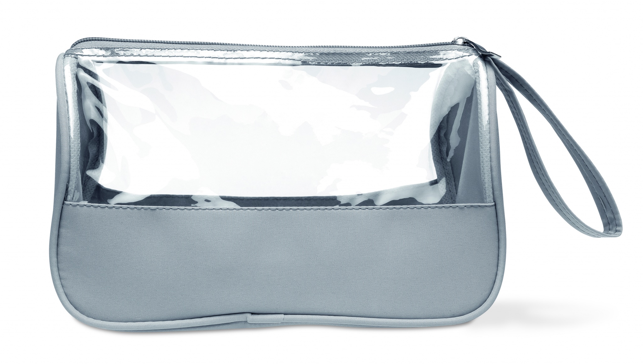 Toilettilaukku mikrokuitua ja PVC- muovia, sisältää ranne hihnan. Ftalaatti vapaa.