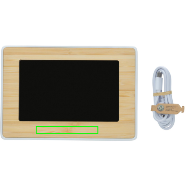 Kello isolla lED-näytöllä valmistettuna RCS (Recycled Claim Standard) sertifioidusta kierrätetystä ABS:stä ja FSC® 100% bambusta. Kierrätetyn materiaalin kokonaismäärä: 76% perustuen tuotteen painoon. RCS sertifiointi varmistaa kierrätettyjen materiaalien täysin sertifioidun toimitusketjun. Korkealaatuinen LED näyttö. Toiminnot: kello, hälytys, lämpötila, 12/24 tunnin vaihtoehdot. Sisältää 100cm tyypin C latauskaapelin, joka on valmistettu RCS-sertifioidusta kierrätetystä TPE:stä. Pakattu FSC®-sekoituksesta valmistettuun kraft-pakkaukseen.