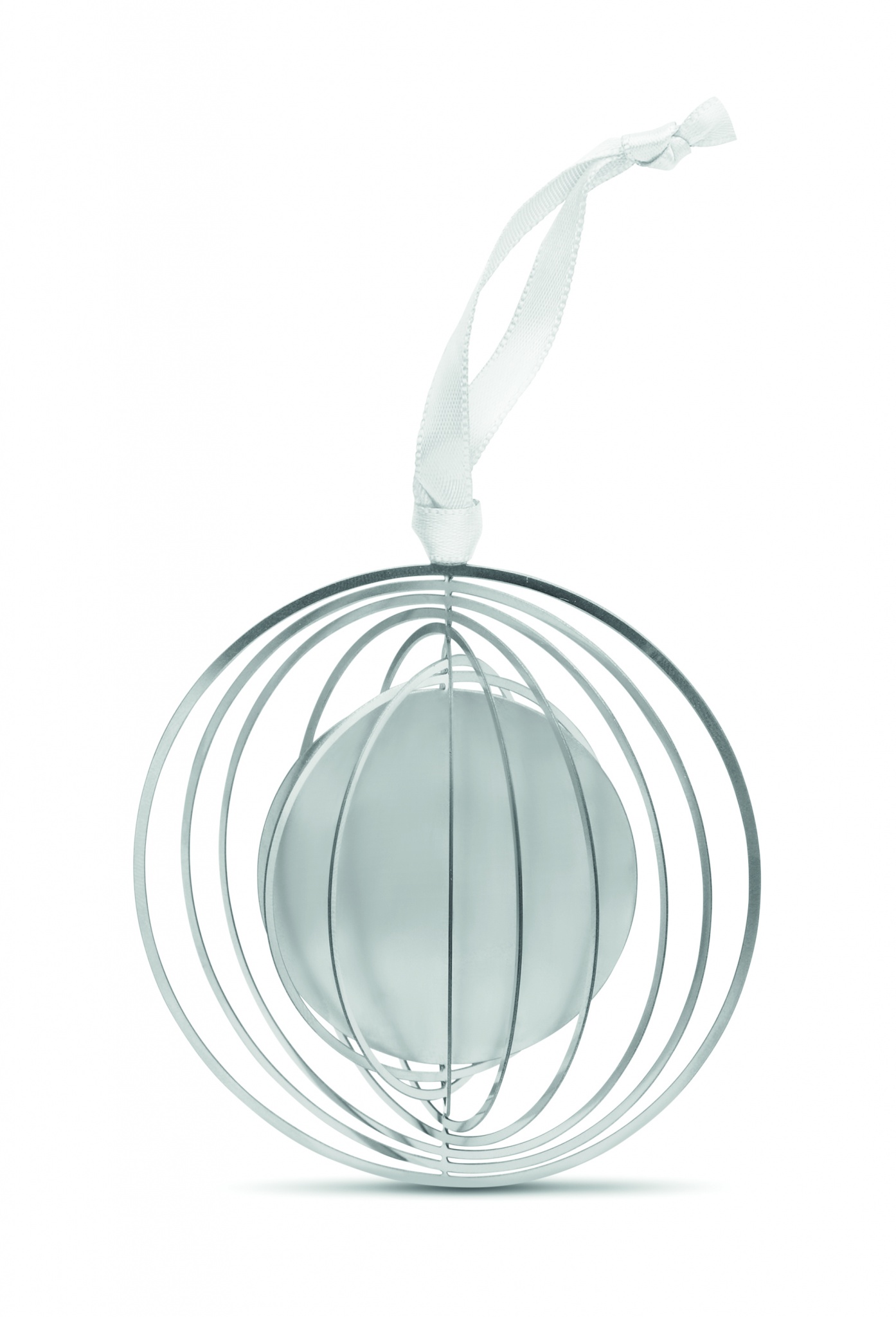 Nerūdijančio plieno apskrito formos dekoratyvinis ornamentas su kaspinu dovanų voke. Lengvai sulankstoma, kad būtų galima išsiųsti ir saugoti.
