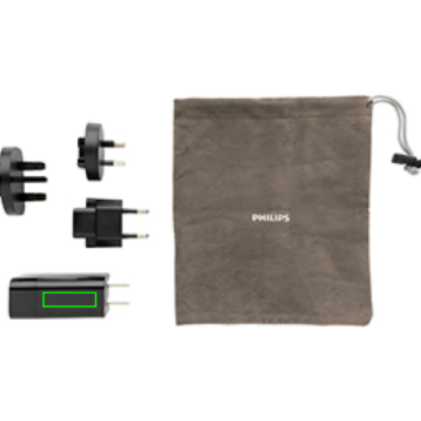 „Philips“ itin greitas 30 W PD kelioninis įkroviklis. Su patogiu kelioniniu maišeliu. Yra su 4 kištukais; integruotas JAV kištukas ir keičiami AU, JK ir ES kištukai. Įvestis: 100-240V, 50-60Hz 0.7A Išvestis USB A 5V/2.4A Type-C 5V/3A, 9V/2A, 12V/1.5A. Supakuota Philips dovanų dėžutėje.