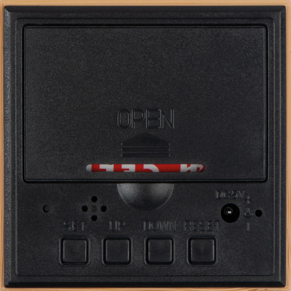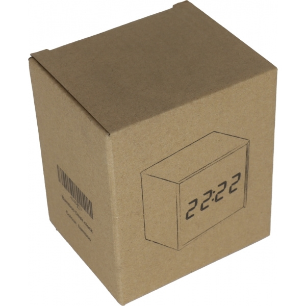 Elegants galda pulkstenis ar koka pārklājumu, melnu displeja laukumu un ziliem LED burtiem, kas pēc kārtas rāda laiku, datumu un temperatūru. Jūsu logotips tiks iegravēts augšpusē.