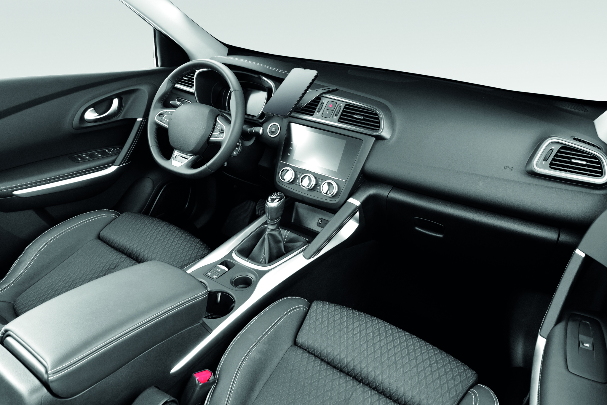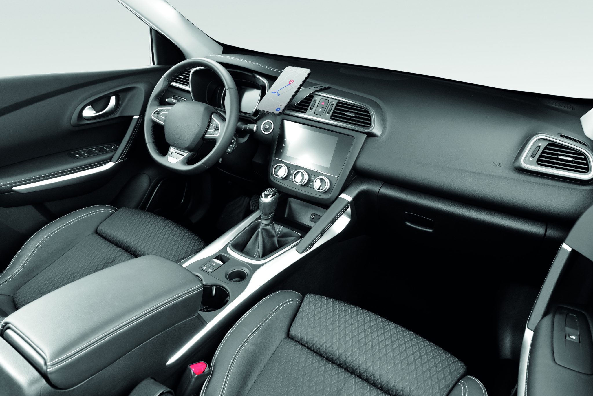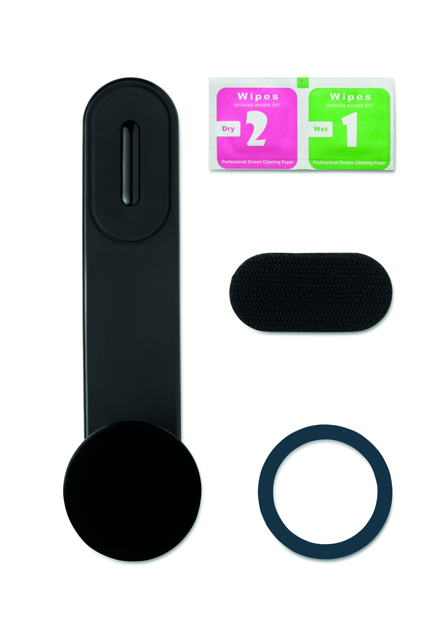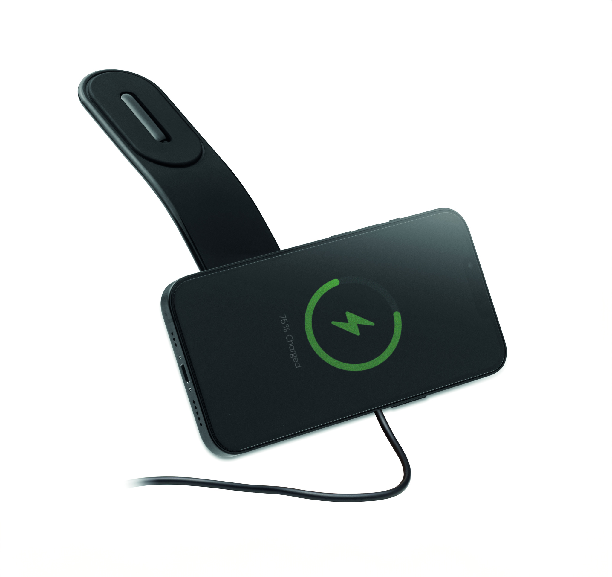 Flexible car mount magnetic wireless charger 15W with phone holder and hook and loop mount. Compatible with iPhone® 12 and newer. Including additional magnetic metal ring to support charging of other non-magnetic wireless chargeable phones.