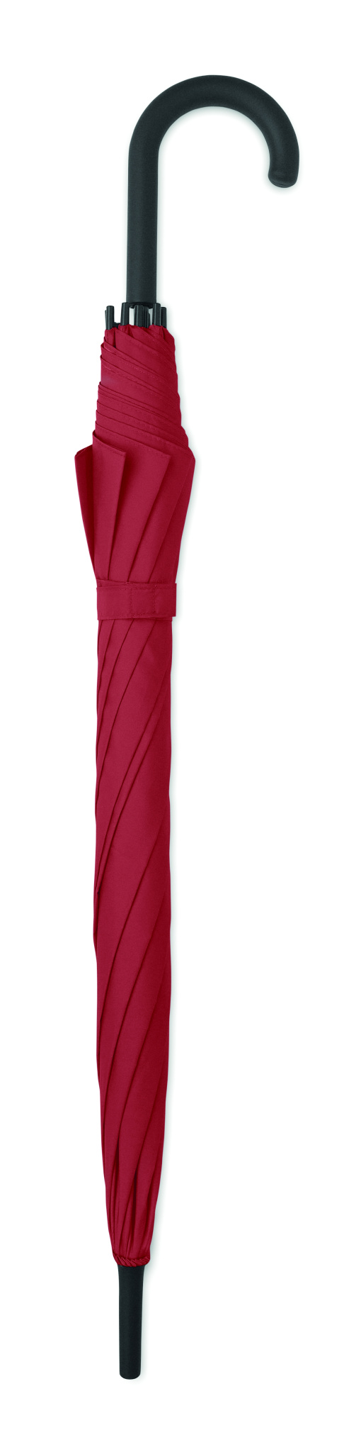 23 inch straight auto open umbrella with black plating metal frame, fibreglass ribs and panels in 190T pongee fabric. Plastic tips and top. Rubberized PP plastic curved handle. Manual closure.