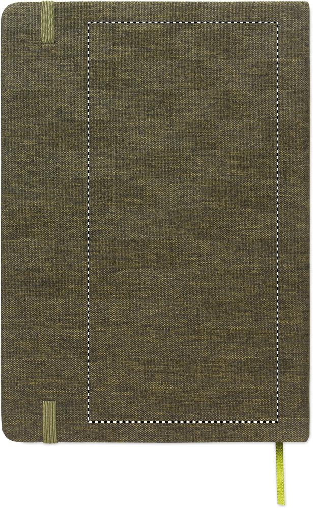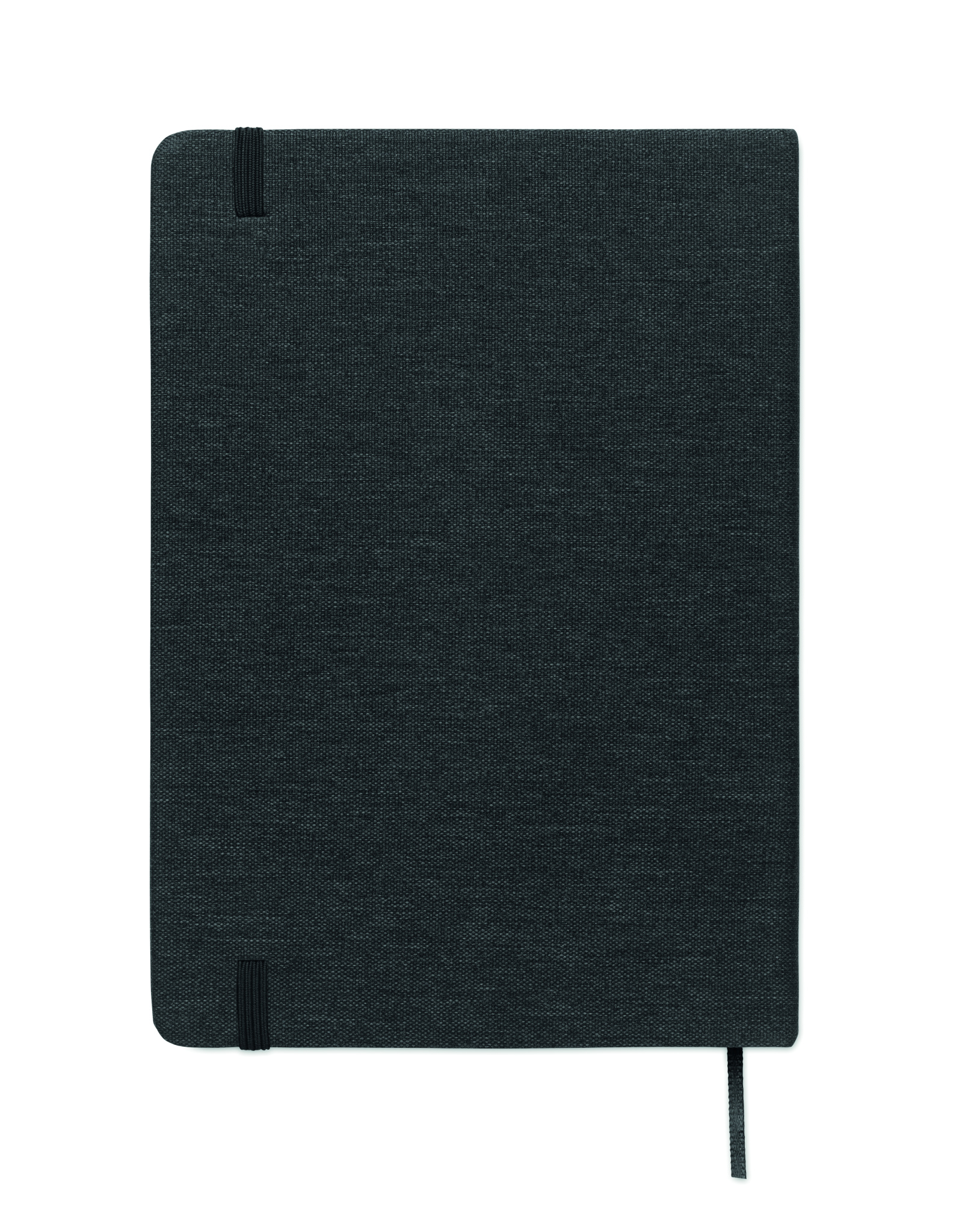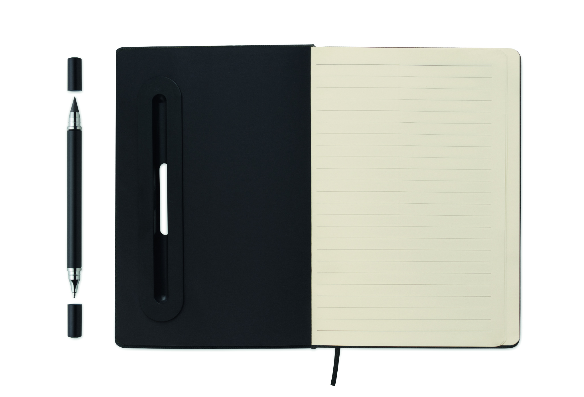 A5 notebook with RPET hard cover with phone holder functionality. Integrated 2-in-1 inkless and regular ballpen in ABS. Casebound. 192 recycled paper lined pages (96 sheets). Matching strap and bookmark.