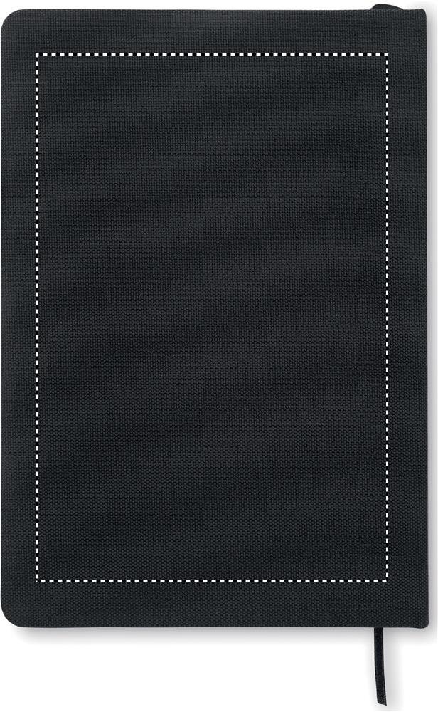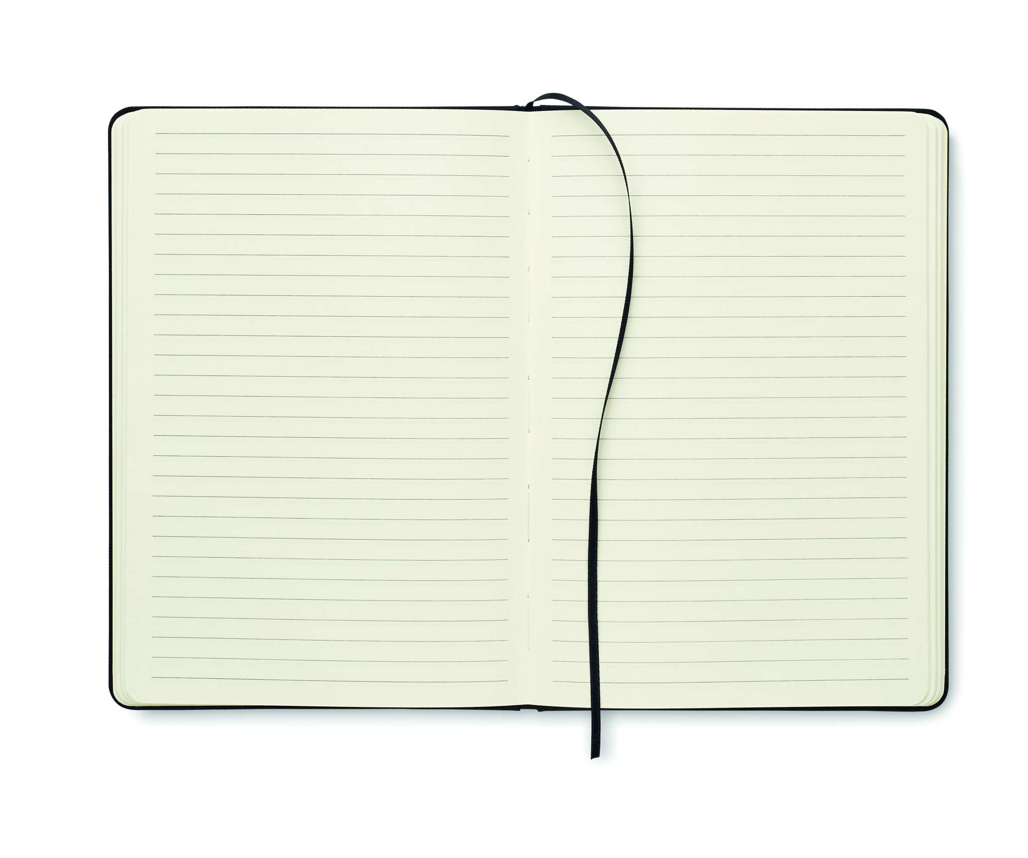 A5 notebook set with 600D RPET hard cover. Front elastic band phone holder function and front pen loop with push ball pen with bamboo grip detail. Case bound. 160 recycled paper lined pages (80 sheets). Includes envelope inside the back cover. Elastic closure strap. Ribbon bookmark. Blue ink.