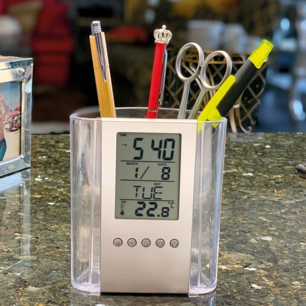 Акриловый держатель для ручек с посеребренной передней частью; часы, будильник, дата, день недели и комнатная температура (C / F), а также батарейка-таблетка. Мы напечатаем ваш логотип под многофункциональным дисплеем.