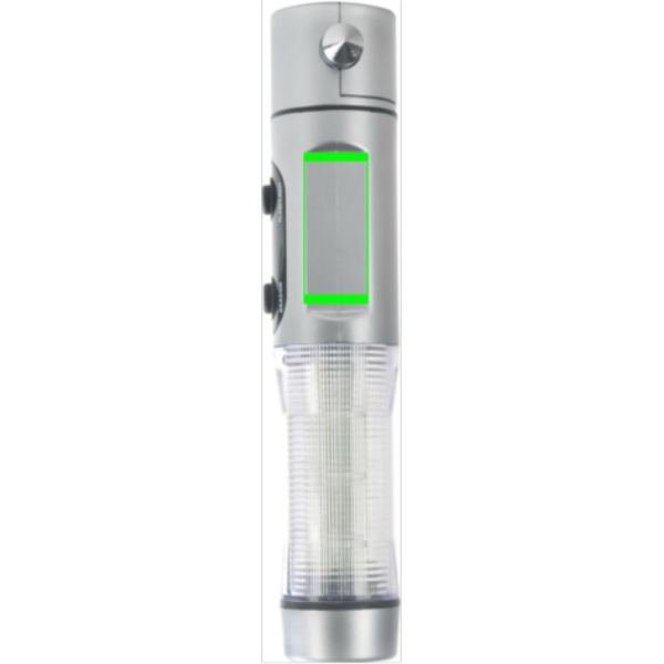 Аварийный фонарь, корпус из серебристого АБС-пластика, 1 белый светодиод и 9 красных проблесковых маячков сбоку, резак, стеклобой и магнитное основание для установки на крыше автомобиля.
