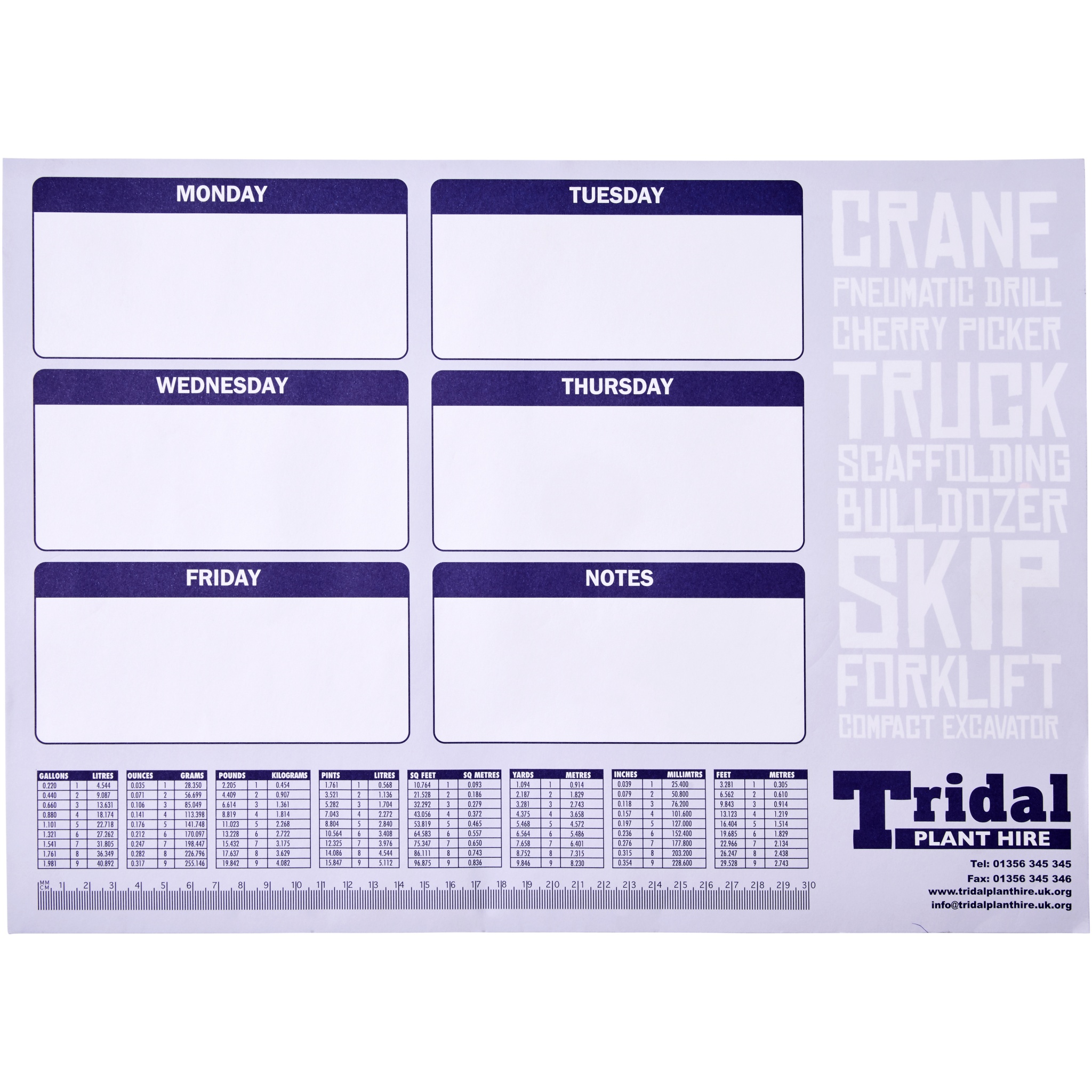 Белый блокнот Desk-Mate® формата А2. Состоит из чистых листов 80 г/м². Стандартный вариант состоит из 50 листов, а также доступно по 25 листов. На каждый лист можно нанести рисунок. Размеры листа: 594x420 мм.