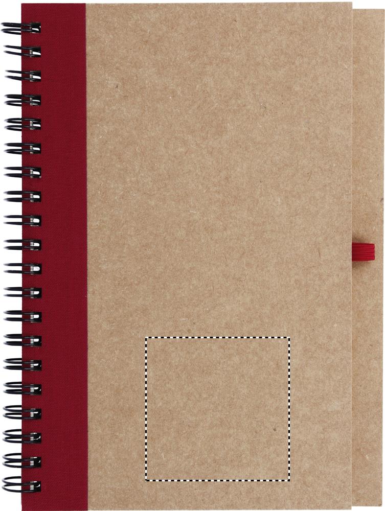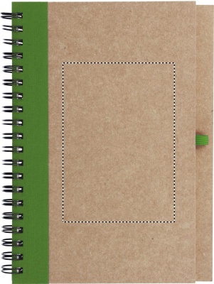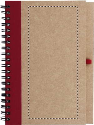 Блокнот из переработанной бумаги с ручкой в цвет. 140 страниц нелинованной переработанной бумаги (70 листов). Нажимная шариковая ручка из переработанного картона и биоразлагаемого пластика. Синие чернила. Эластичный держатель для ручки в цвет.