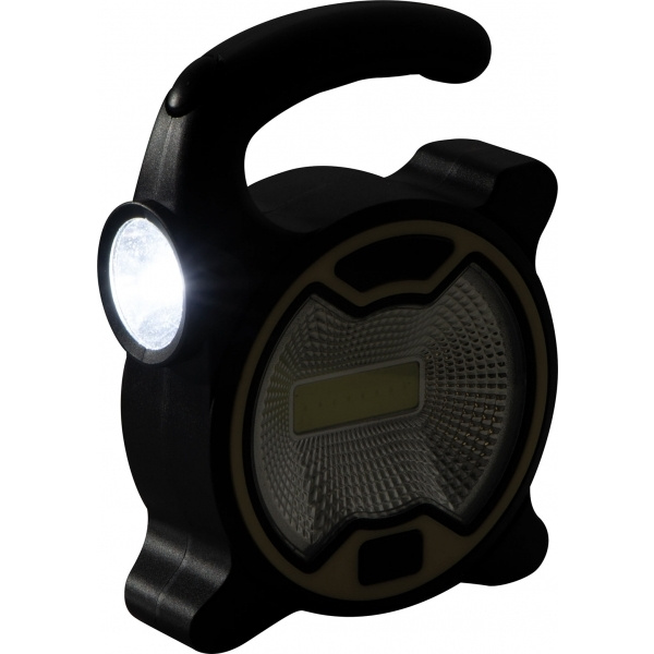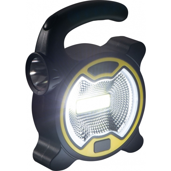 Удобный рабочий фонарь COB из пластика с дополнительной лампой сбоку, безопасной подставкой и ручкой для переноски. Напечатаем ваш логотип сзади.
