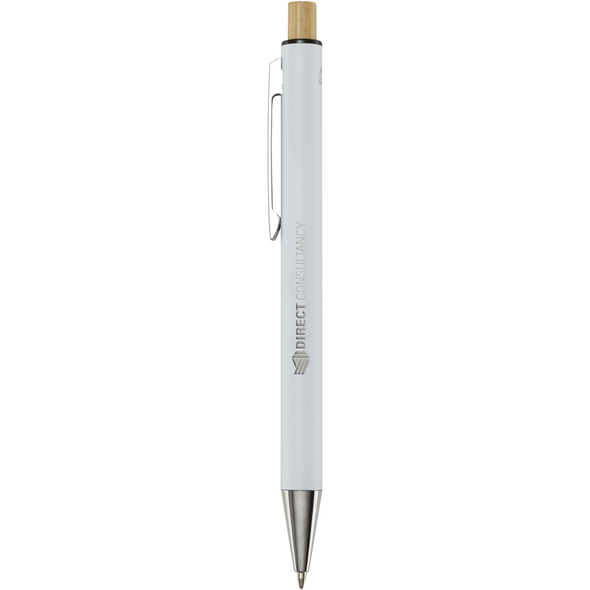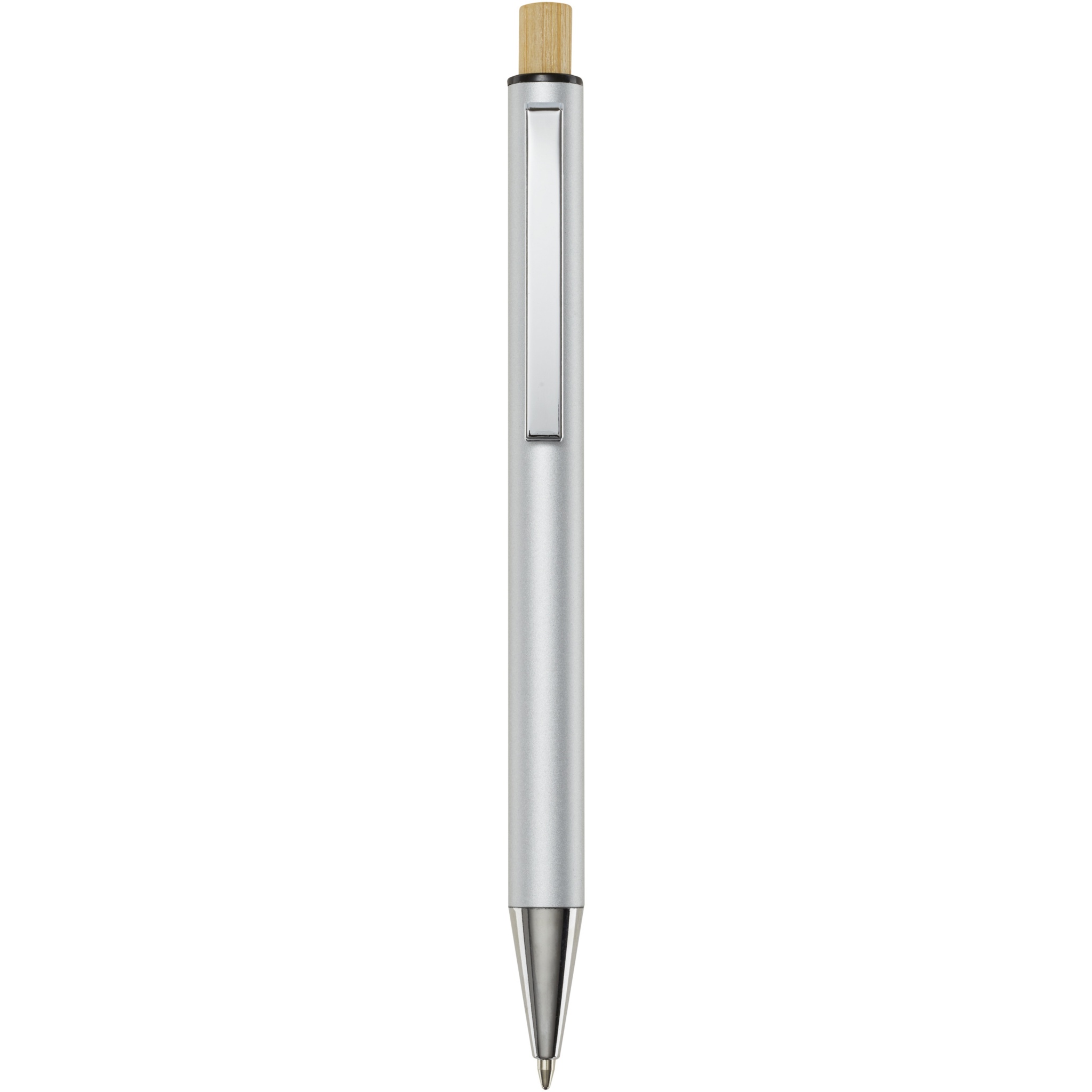 Шариковая ручка Cyrus изготовлена из переработанного алюминия, что требует меньше энергии, чем производство алюминия из сырья. Это также уменьшает количество отходов на свалках и помогает сохранять природные ресурсы для сокращения выбросов парниковых газов. Нажимная кнопка изготовлена из бамбука. Цвет чернил: синий. Длина непрерывной линии: 800 метров. Размер пера: 1,00 мм.