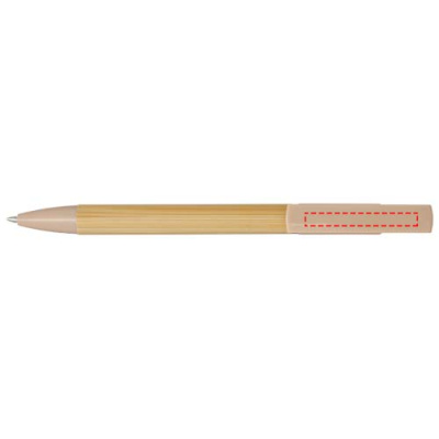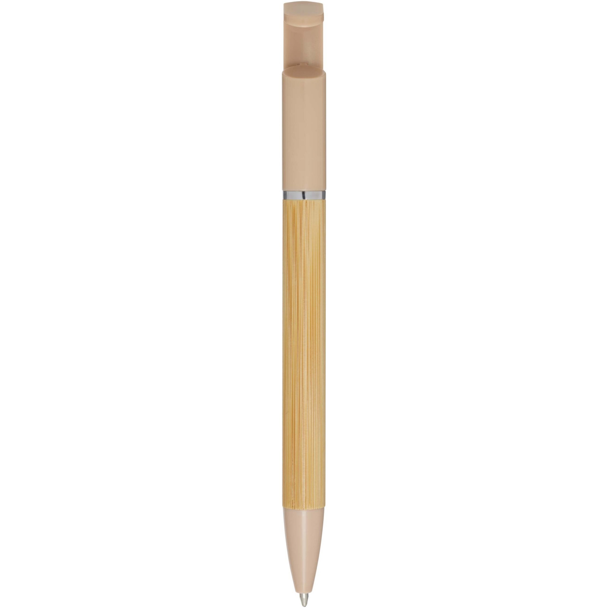 Бамбуковая шариковая ручка, которая также может служить подставкой для телефона. Кнопка и среднее кольцо изготовлены из переработанного пластика, наконечник — из латуни, а корпус — из бамбука, полученного из ответственных источников. Цвет чернил: черный. Длина непрерывной линии: 1000 метров. Размер пера: 1,0 мм.
