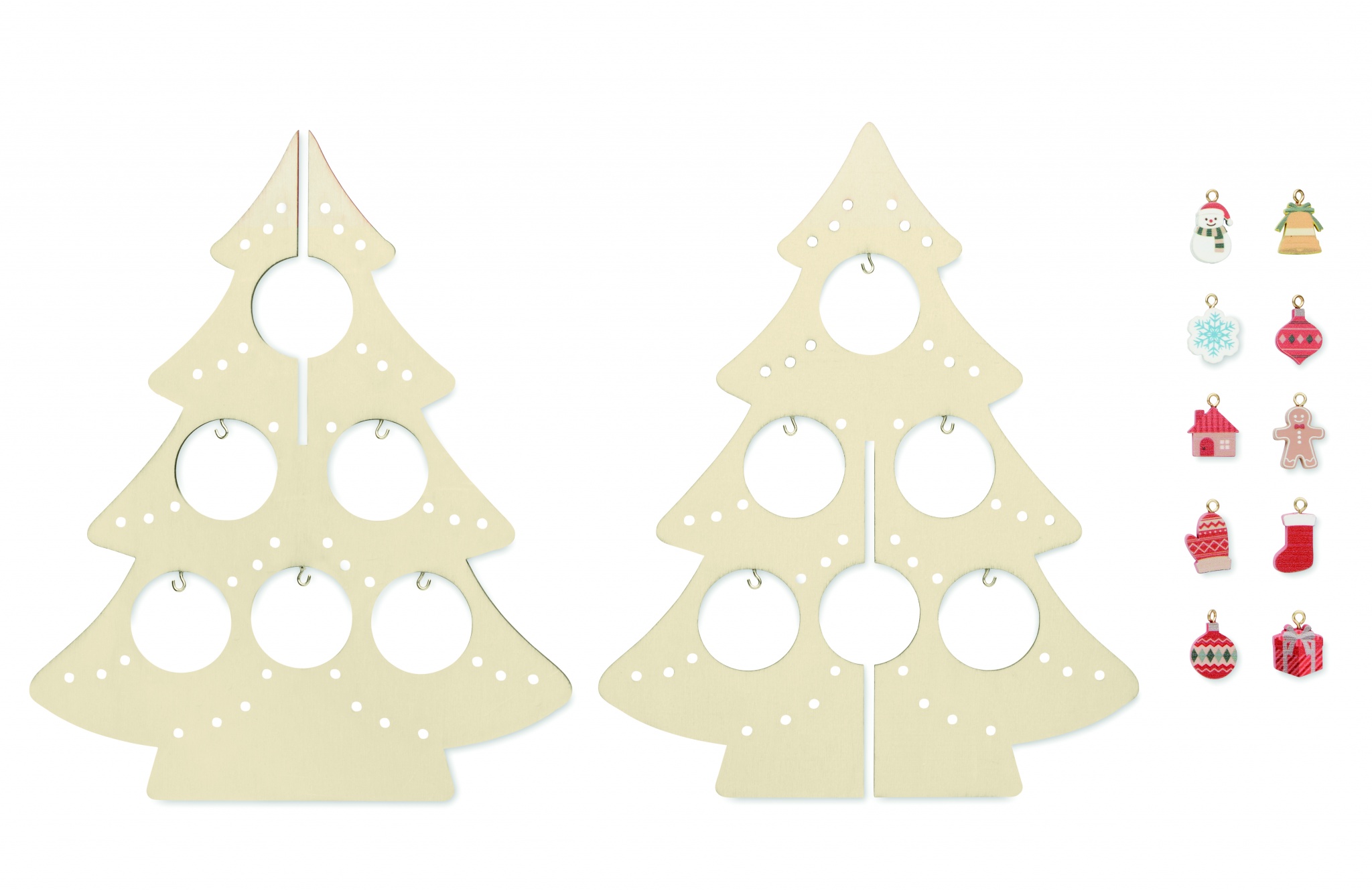 Фанерная силуэтная елка с 10 различными украшениями. Требуется сборка.