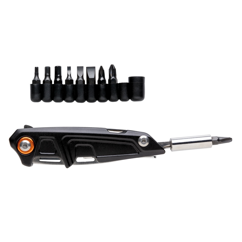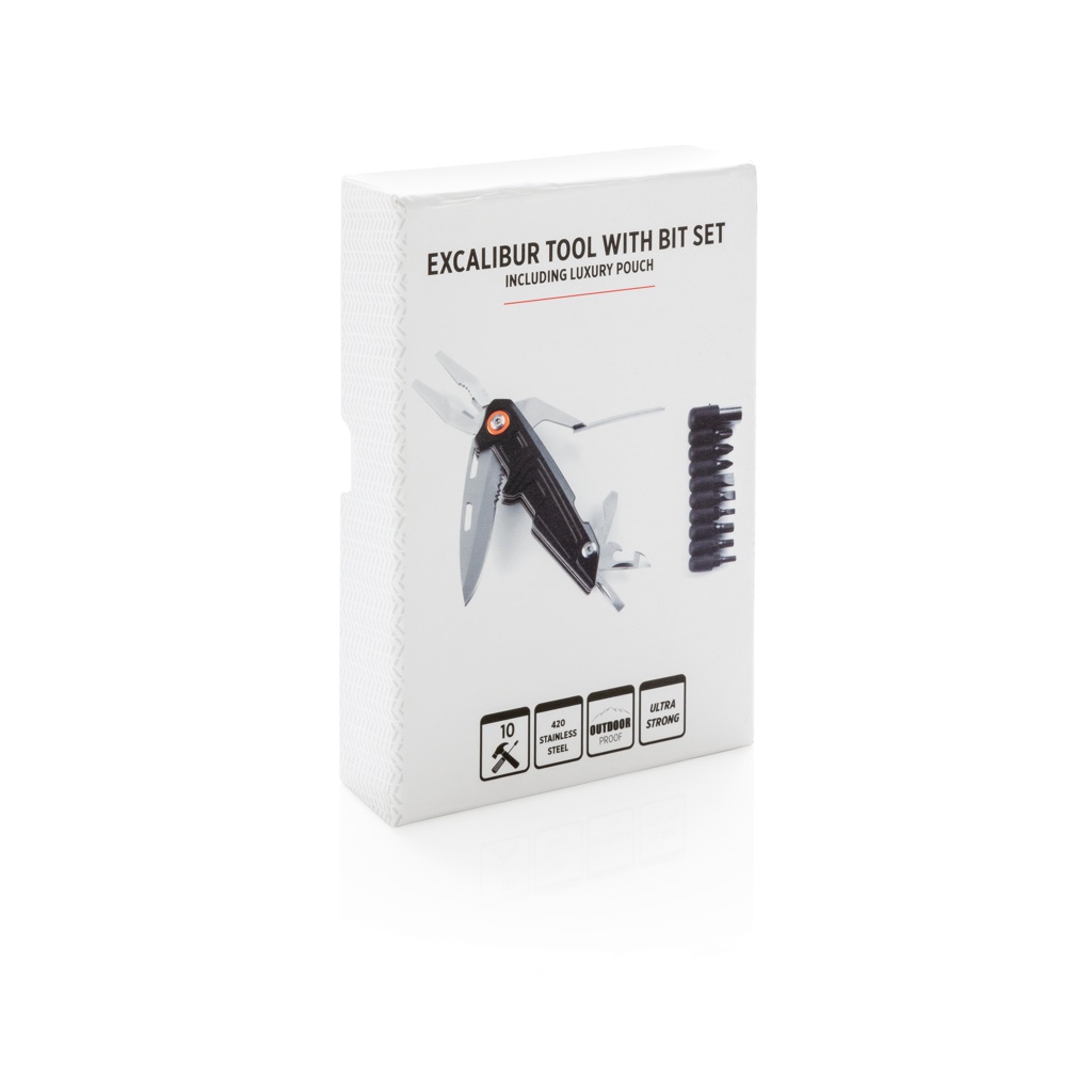 Сверхпрочный инструмент с 10 отдельными функциями и 9 дополнительными битами. Упакован в роскошную подарочную коробку, включающую высококачественный чехол 1680D. Алюминиевый корпус и инструменты из нержавеющей стали. В комплект входят: плоскогубцы с длинными носами, стандартные плоскогубцы, кусачки, нож, зубчатое лезвие, консервный нож, открывалка для бутылок, плоская отвертка, адаптер для бит отвертки, набор бит отверток 9 в 1.