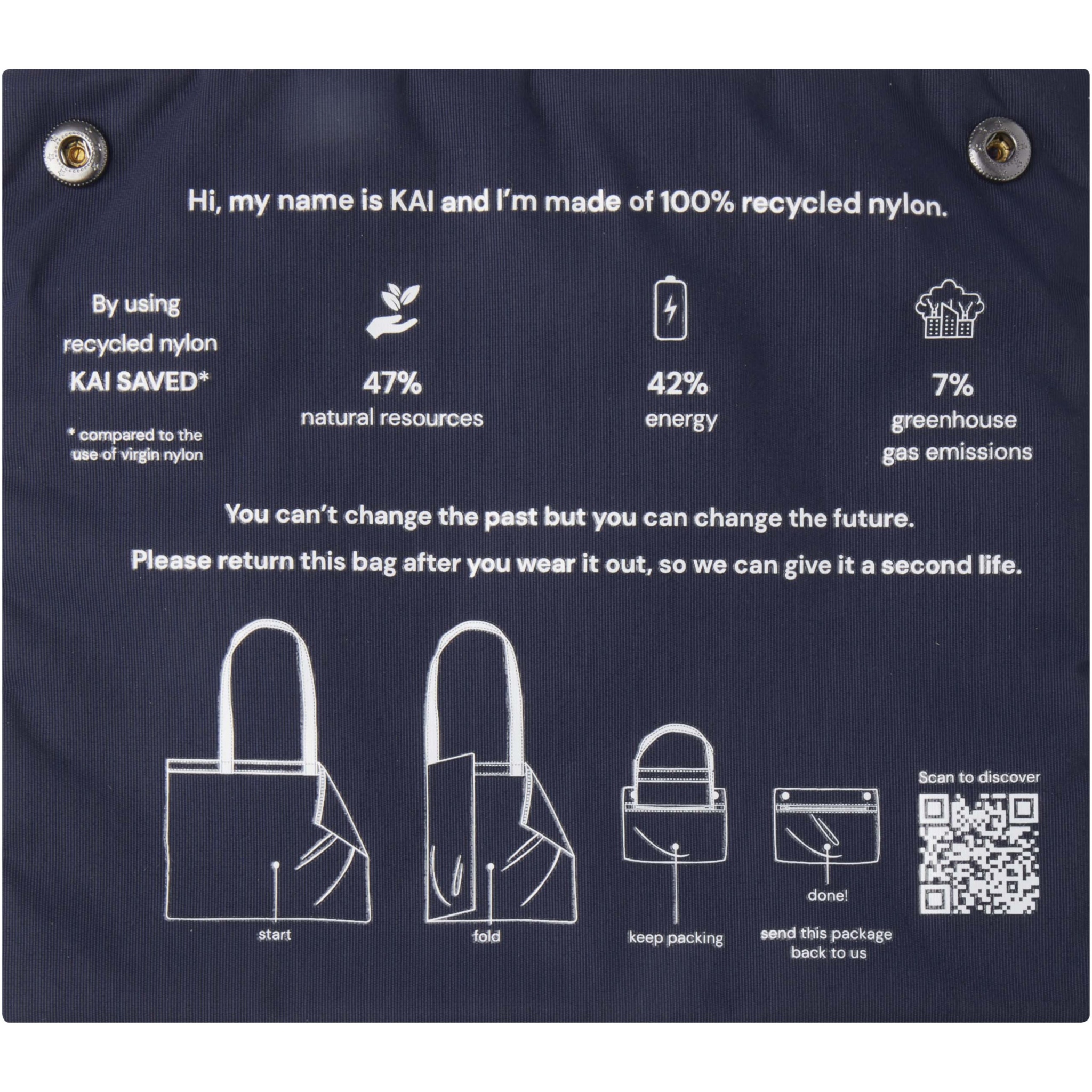 Круглая эко-сумка Kai из переработанного материала, сертифицированного согласно GRS, – самый большой положительный фактор с точки зрения экологических показателей. Более устойчивые исследования начинаются с лучшего дизайна – дизайна, оказывающего меньшее воздействие на окружающую среду. Общее среднее снижение воздействия, уже достигнутое при использовании 1 сумки, составляет: 7 % выбросов углерода, 42 % затрат на энергию и 47 % экологических затрат. Сделанная из переработанного нейлона плотностью 200T, сертифицированного согласно GRS, сумка Kai представляет собой классическую и неустаревающую эко-сумку, подходящую для повседневного использования. Место для печати — на кармане, который одновременно служит чехлом. Сумку можно вернуть с помощью программы возврата с использованием QR-кода, который предоставляет дополнительную информацию.