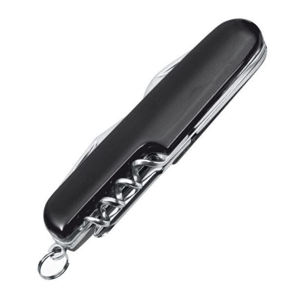 Удобный карманный нож из нержавеющей стали с семью частями, включая большое лезвие, открывалку для банок и бутылок, штопор, крестовую и шлицевую отвертку и кольцо для ключей. Мы гравируем ваш логотип на алюминиевой оболочке.