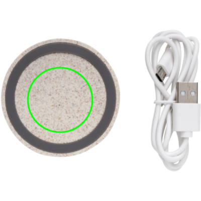 Беспроводное зарядное устройство из пшеничного волокна (15%), смешанного с АБС, для зарядки всех беспроводных устройств. С силиконовым кольцом, которое предотвращает скольжение телефона. Светодиодный индикатор загорается во время зарядки устройства. Совместимо со всеми устройствами с поддержкой QI, такими как Android последнего поколения, iPhone 8 и выше. Вход: 5 В/1,5 А. Беспроводной выход: 5 В/1 А, 5 Вт. В комплект входит 50-сантиметровый кабель TPE micro USB без ПВХ.