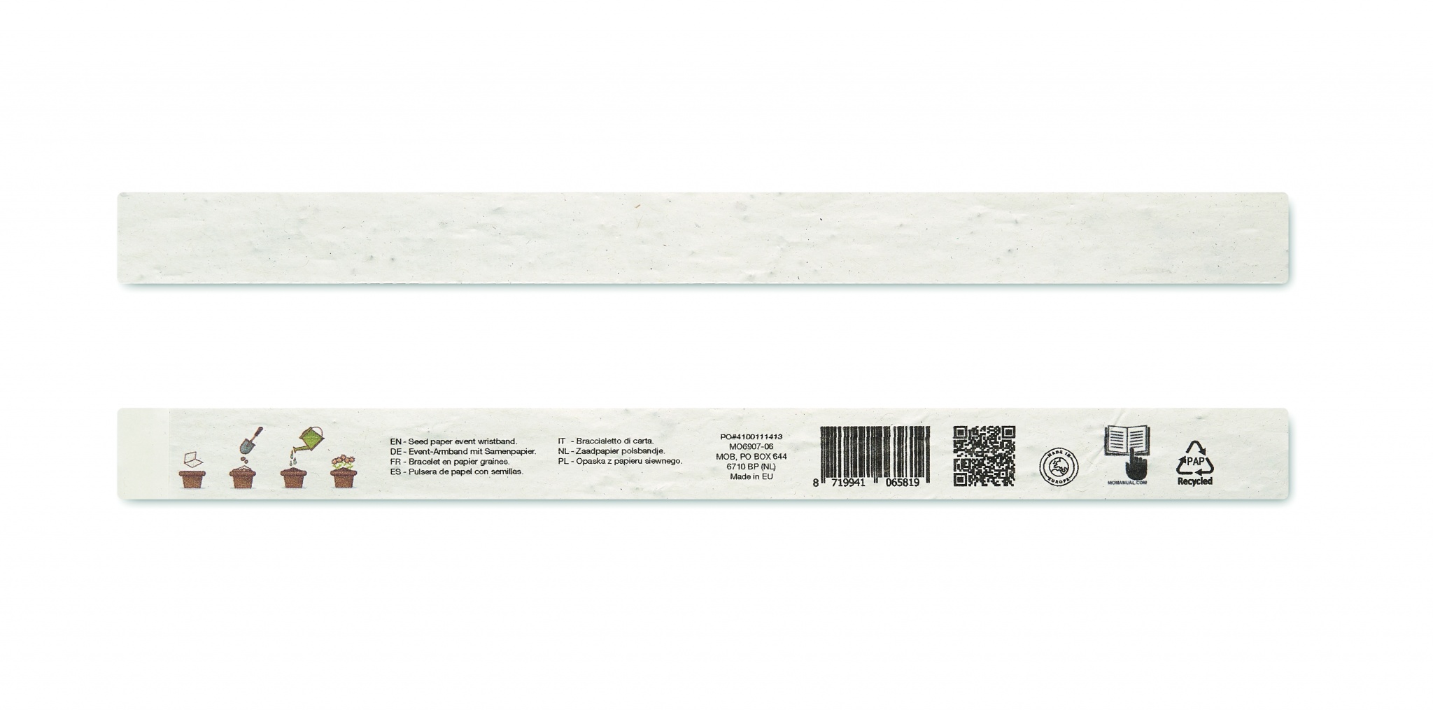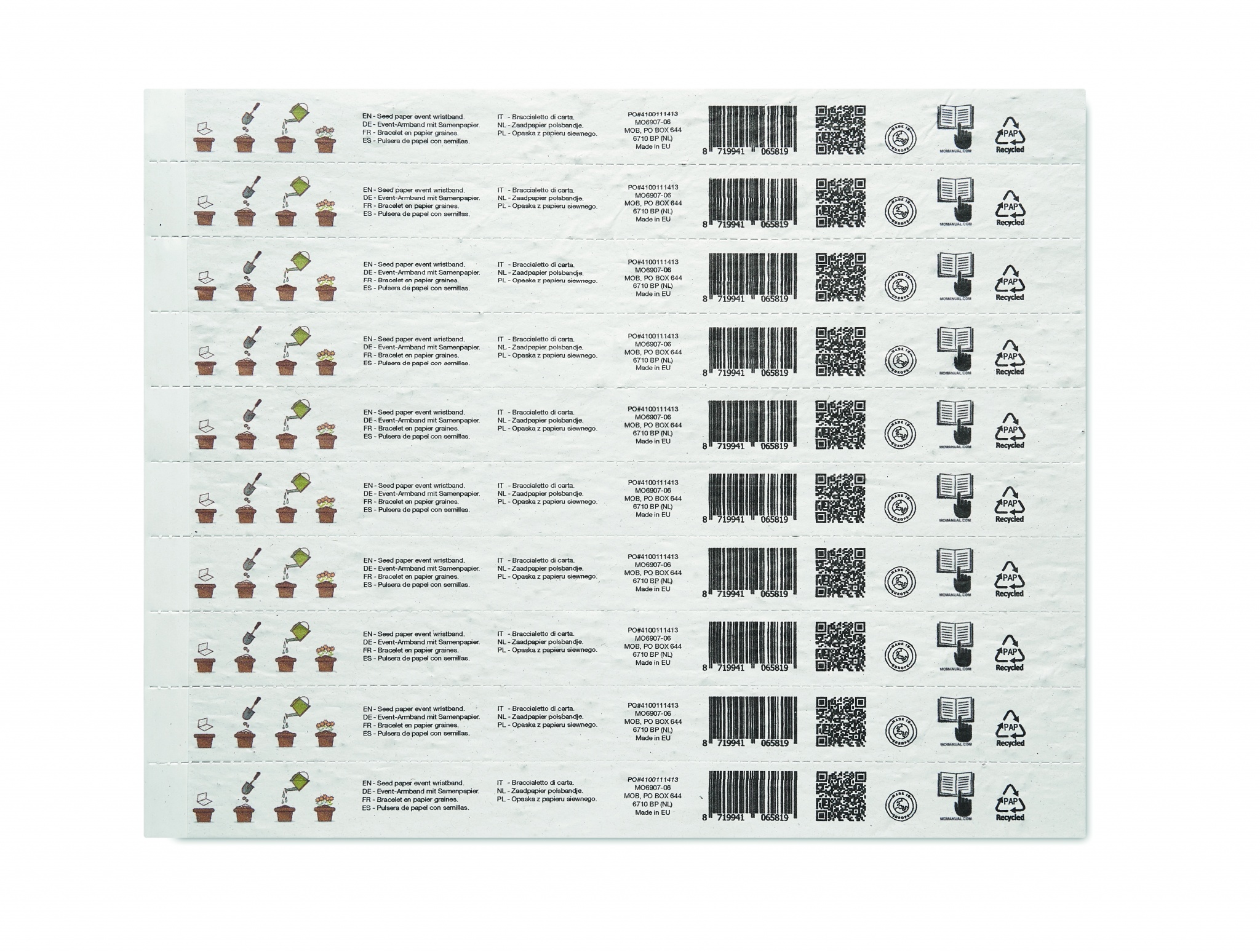 Набор из 10 бумажных браслетов для мероприятий. Бумага из переработанного сырья с семенами полевых цветов. Ширина 19 мм. Изготовлено в ЕС.